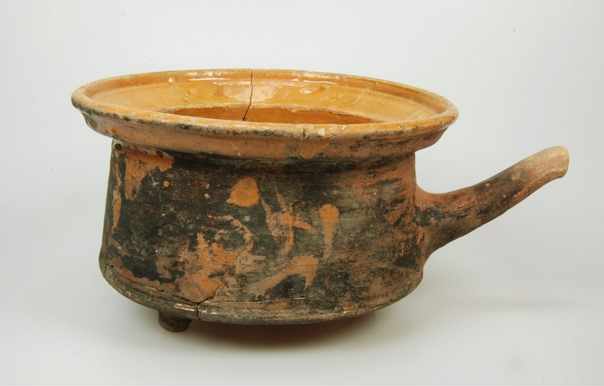 Grape; r-gra-51; diepe grape/sluitpan met scherpe knik van bodem naar verticale wand, naar buiten geknikte verdikte rand met dekselgeul, ribbel op randaanzet roodbakkend aardewerk; inwendig bruin loodglazuur; drie poten; buitenzijde broet; herkomst: Nederland (Bergen op Zoom?)