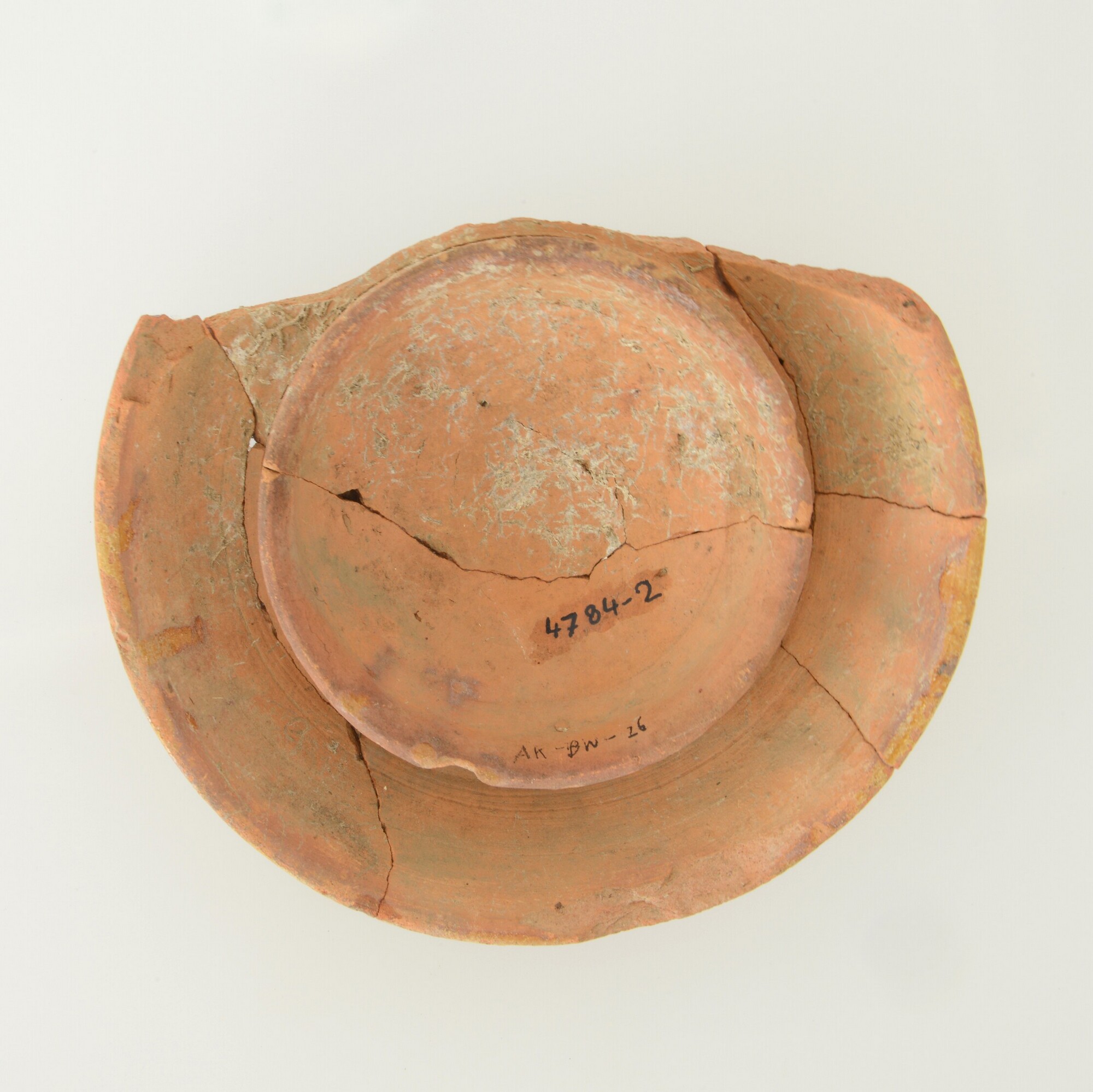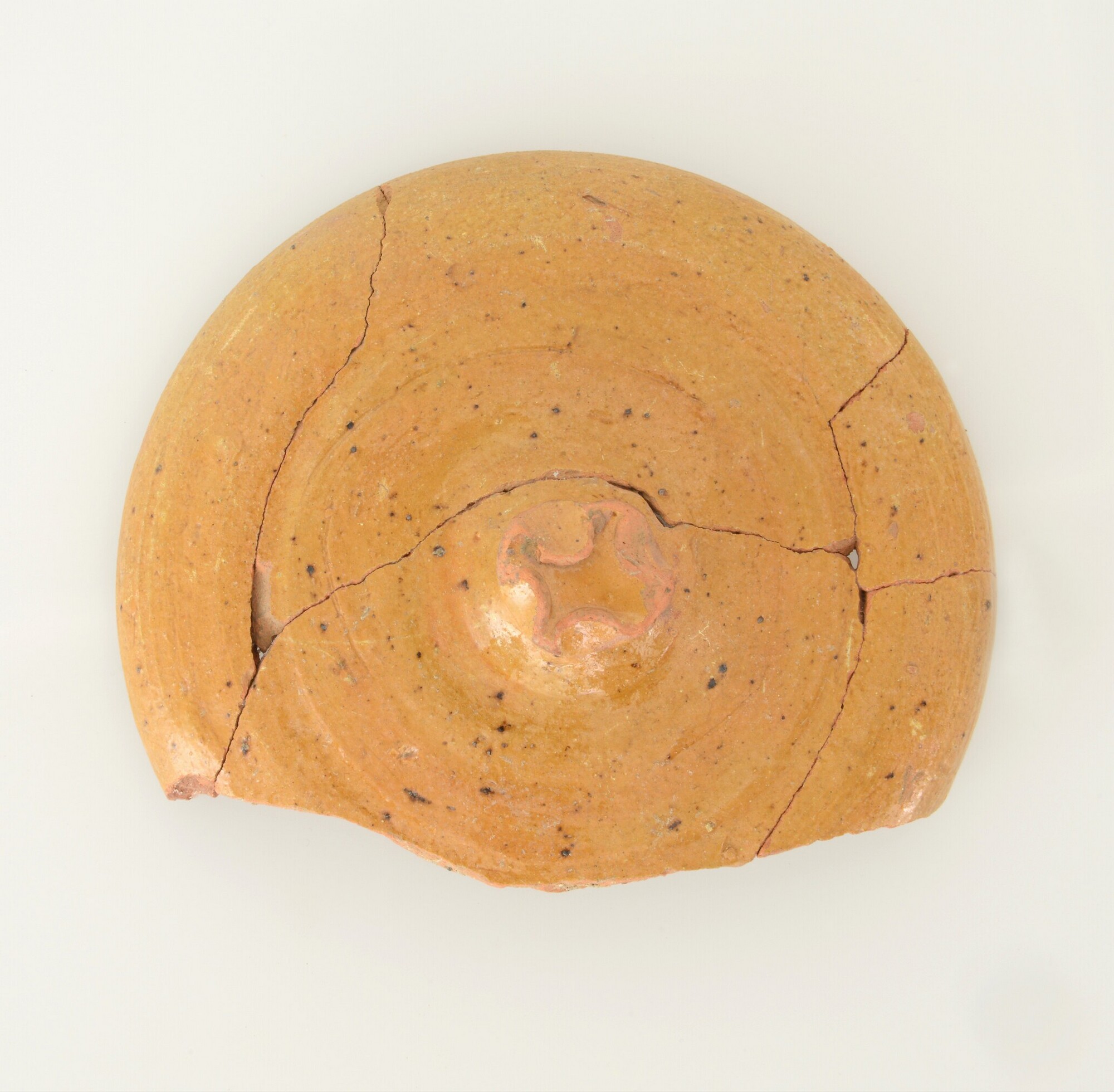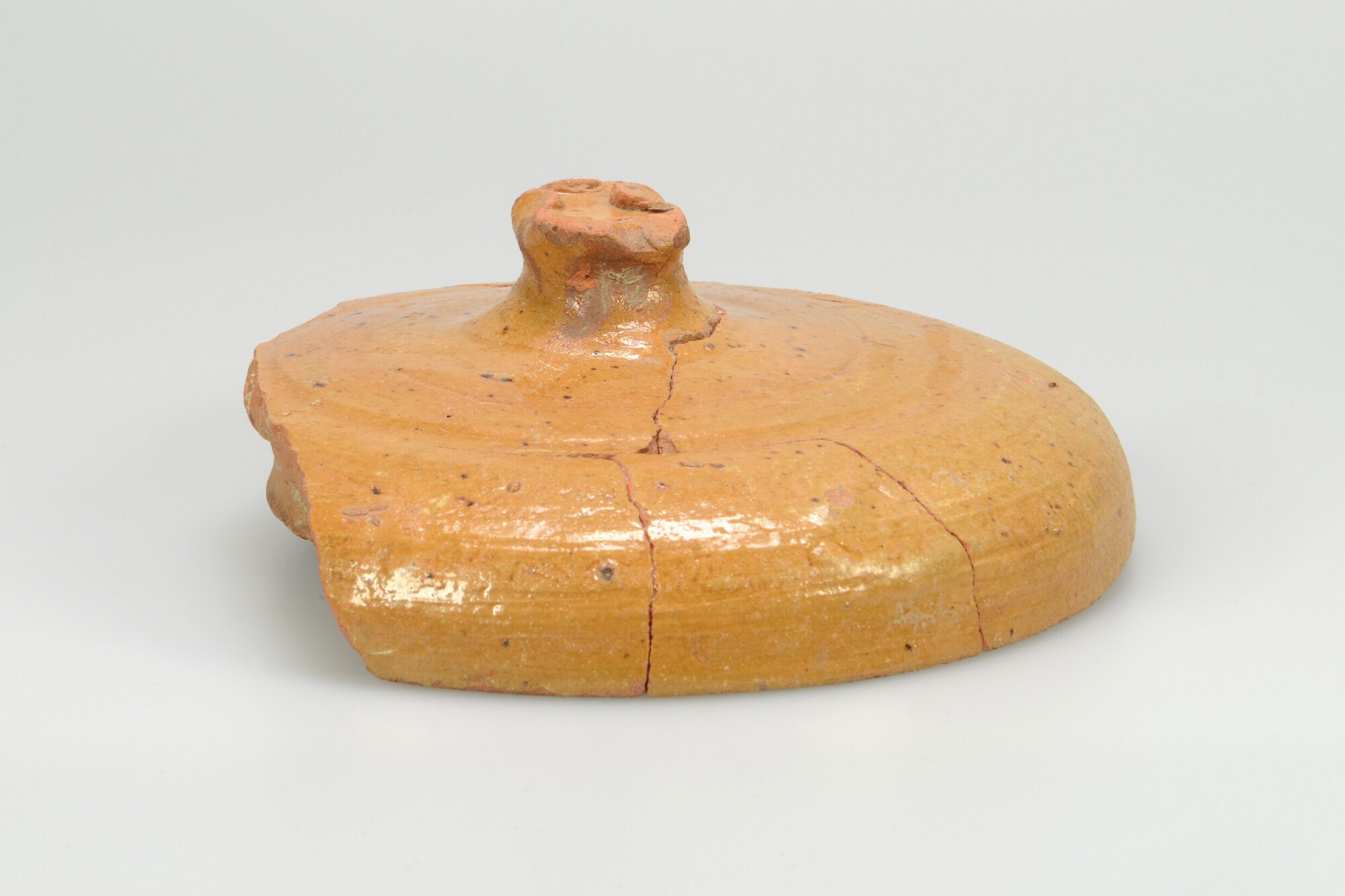 Deksel; r-dek-4; doofpotdeksel met dubbele sluitrand en knop; roodbakkend aardewerk; uitwendig loodglazuur; geknepen knop; herkomst: Nederland