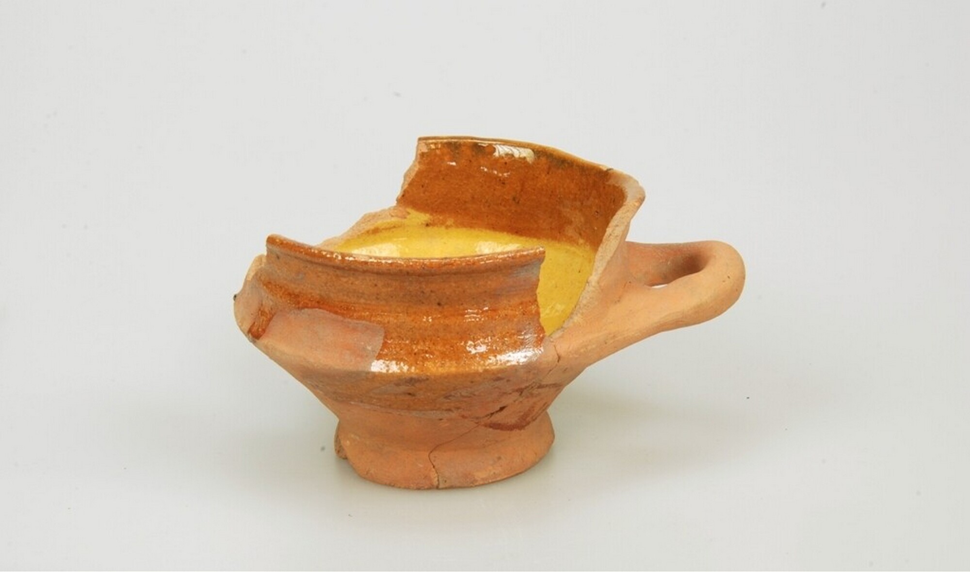 Kop; r-kop-4; roodbakkend aardewerk; inwendig loodglazuur; standvoet; horizontaal worstoor; herkomst: Nederland