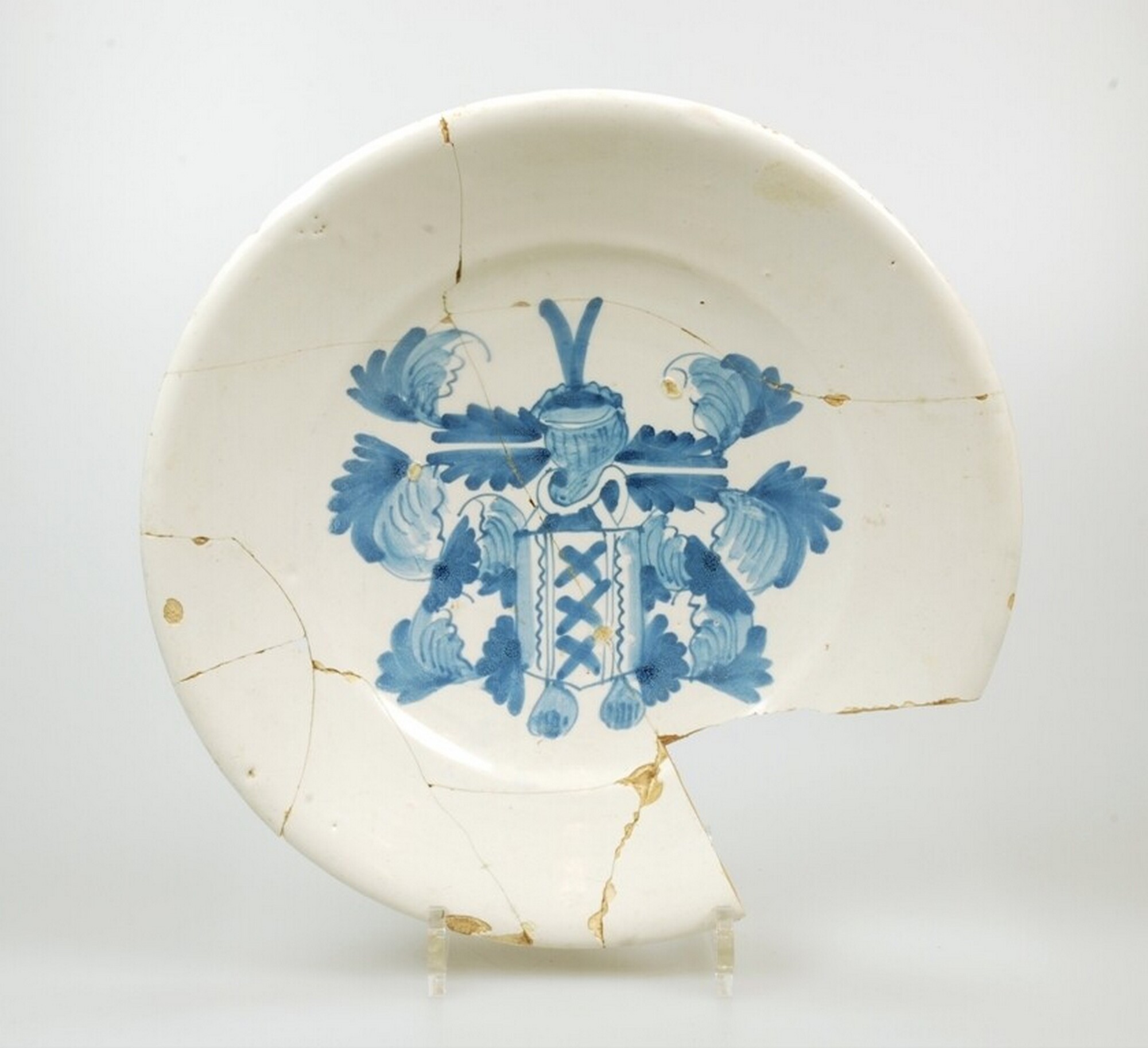 Bord; m-bor-3; Nederlands majolica; voorzijde tinglazuur, achterzijde loodglazuur; spiegel: wapen van Amsterdam in blauw; standring; herkomst: Friesland