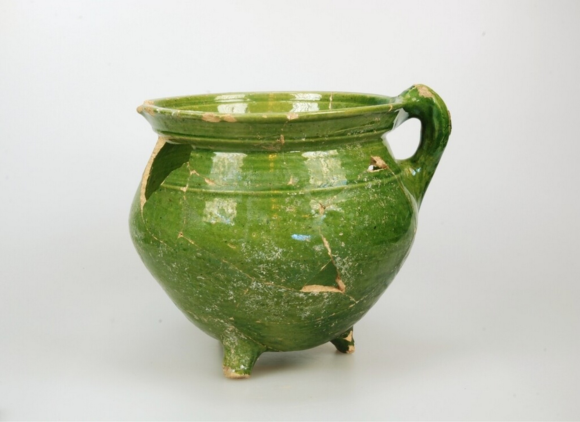 Grape; w-gra-7; witbakkend aardewerk; in- en uitwendig loodglazuur; uitwendig koperoxide; drie poten; verticaal worstoor; schenklip; herkomst: Nederland (Alkmaar?)
