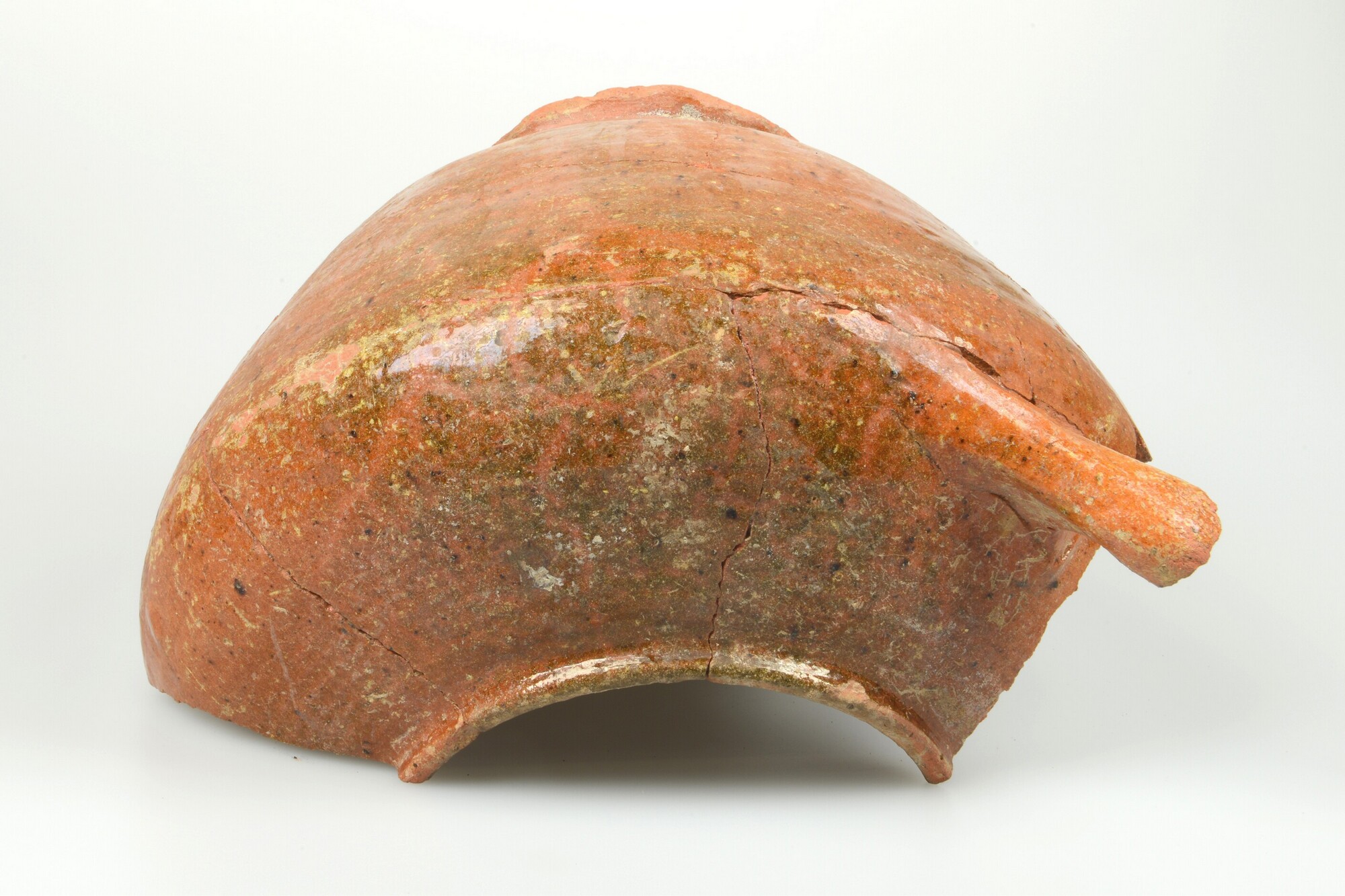 Doofpot; r-pot-3; bolle pot met hoge schouder en opstaande lip met dekselgeul; roodbakkend aardewerk; uitwendig loodglazuur; standring; twee verticale worstoren; herkomst: Nederland