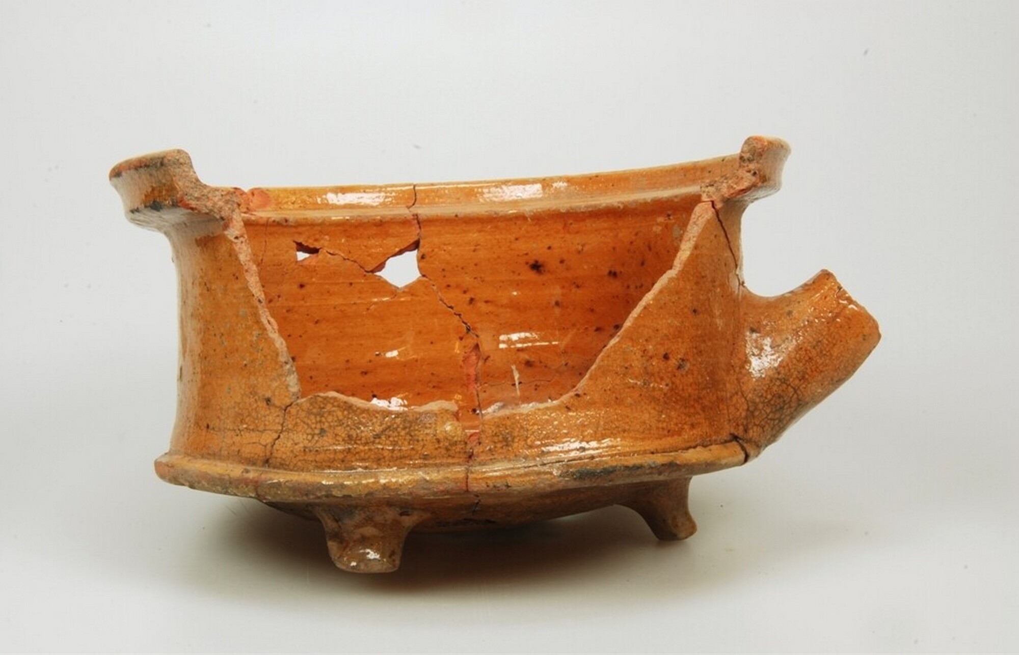 Grape; r-gra-51; diepe grape/sluitpan met scherpe knik van bodem naar verticale wand, naar buiten geknikte verdikte rand met dekselgeul, ribbel op randaanzet; roodbakkend aardewerk; in- en uitwendig loodglazuur; drie poten; gebogen steel; herkomst: Nederland (Bergen op Zoom?)