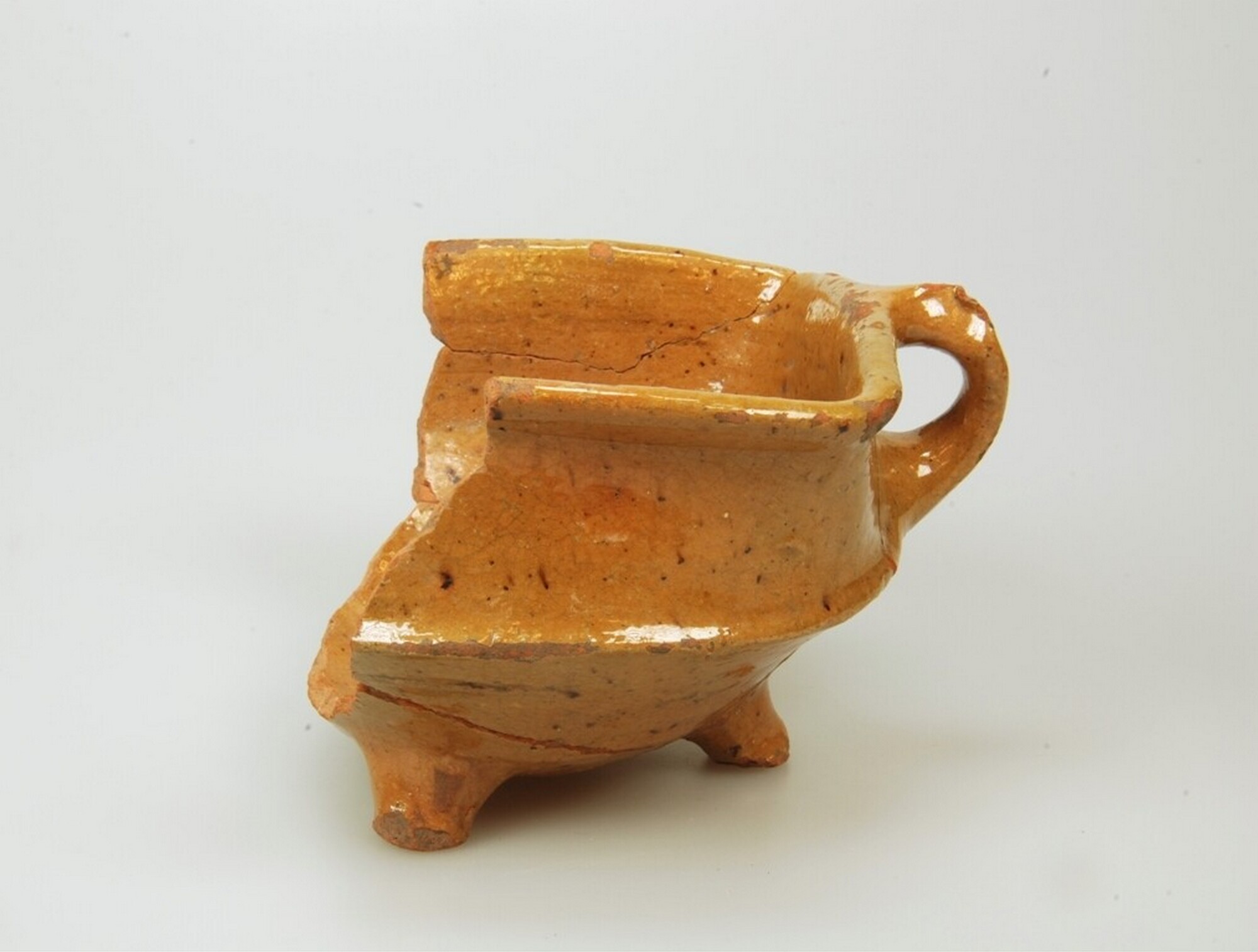 Test; r-tes-3; roodbakkend aardewerk; in- en uitwendig loodglazuur; drie poten; verticaal worstoor midden op de wand; herkomst: Nederland