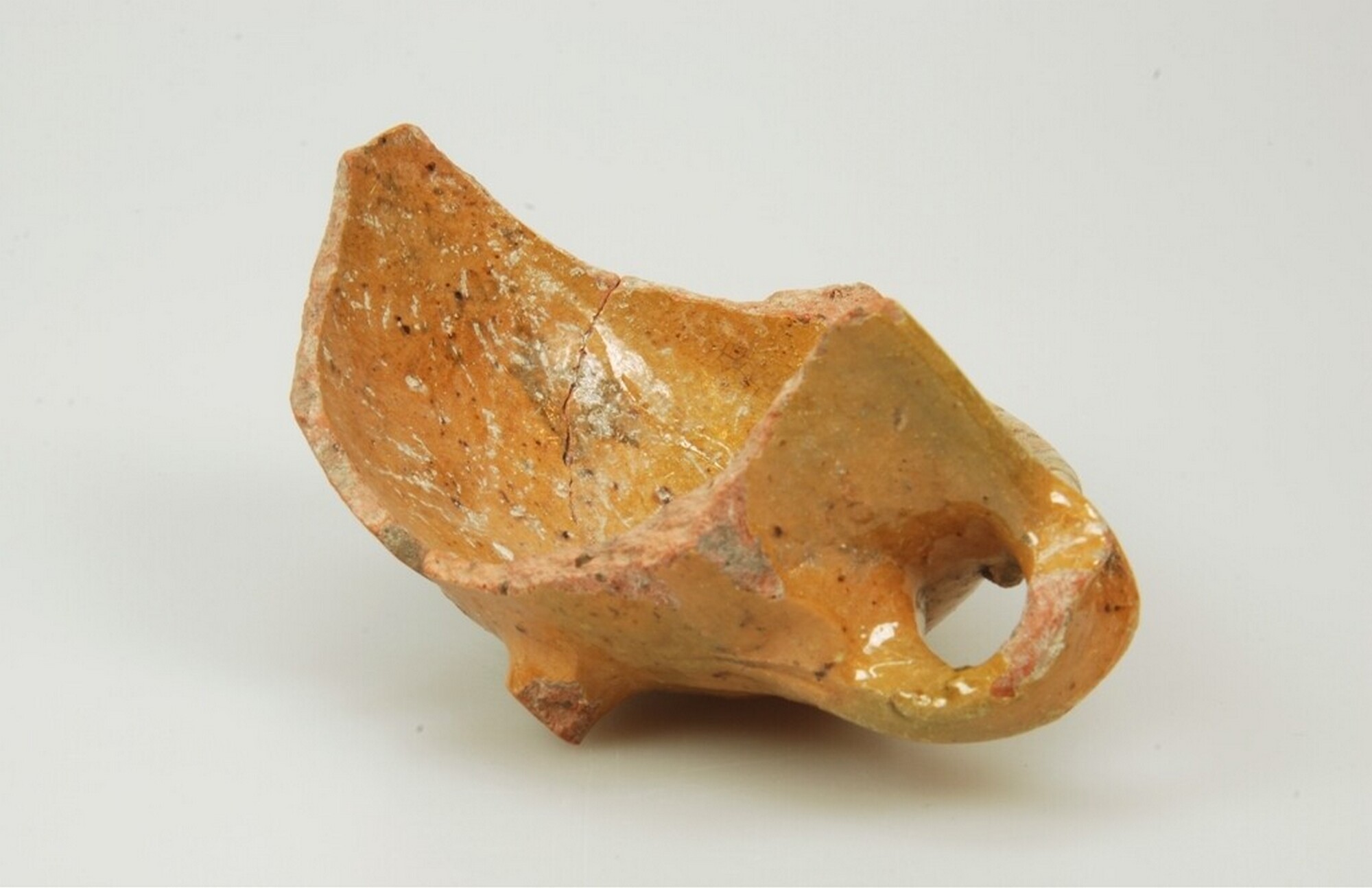 Test; r-tes-3; roodbakkend aardewerk; in- en uitwendig loodglazuur; drie poten; verticaal worstoor midden op de wand; herkomst: Nederland