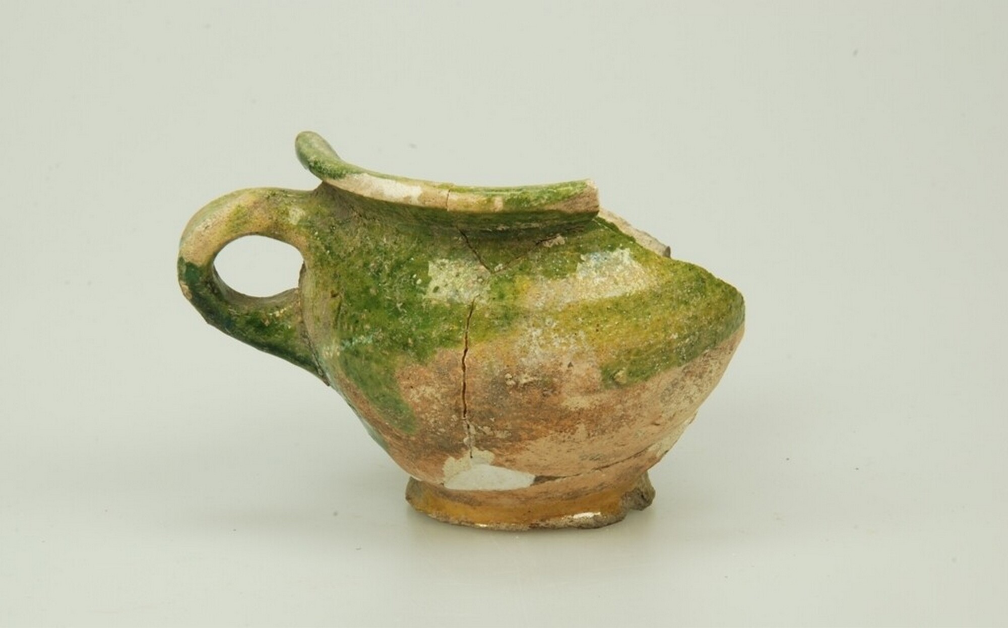 Kop; w-kop-40; witbakkend aardewerk; in- en uitwendig loodglazuur en koperoxide; standvoet; verticaal lintoor; herkomst: Nederland