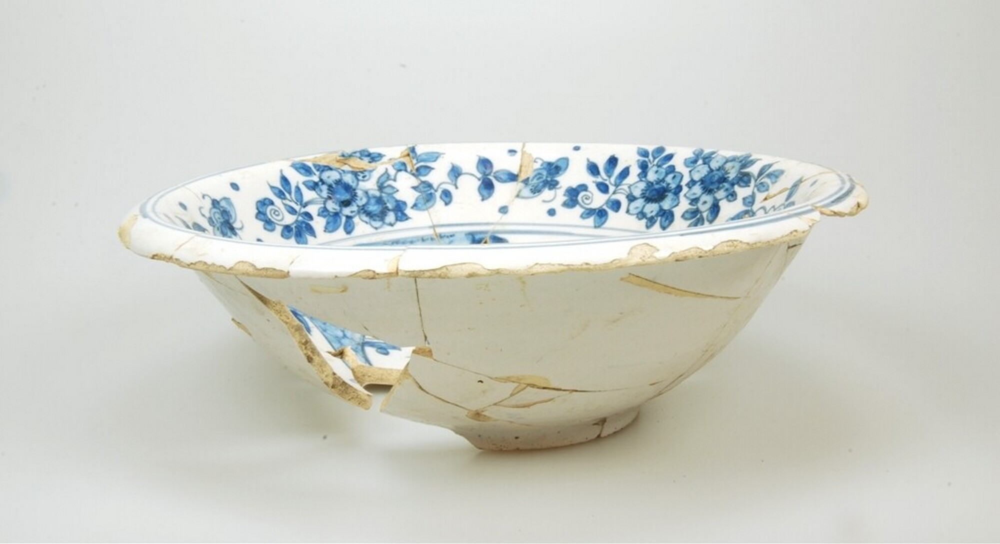 Kom; f-kom-3; afgeronde kom met uitgebogen rand; Nederlands faience; voor- en achterzijde tinglazuur; blauw op witte beschildering: spiegel: bloemenvazen, vlag: bloemmotieven; standring; herkomst: Delft