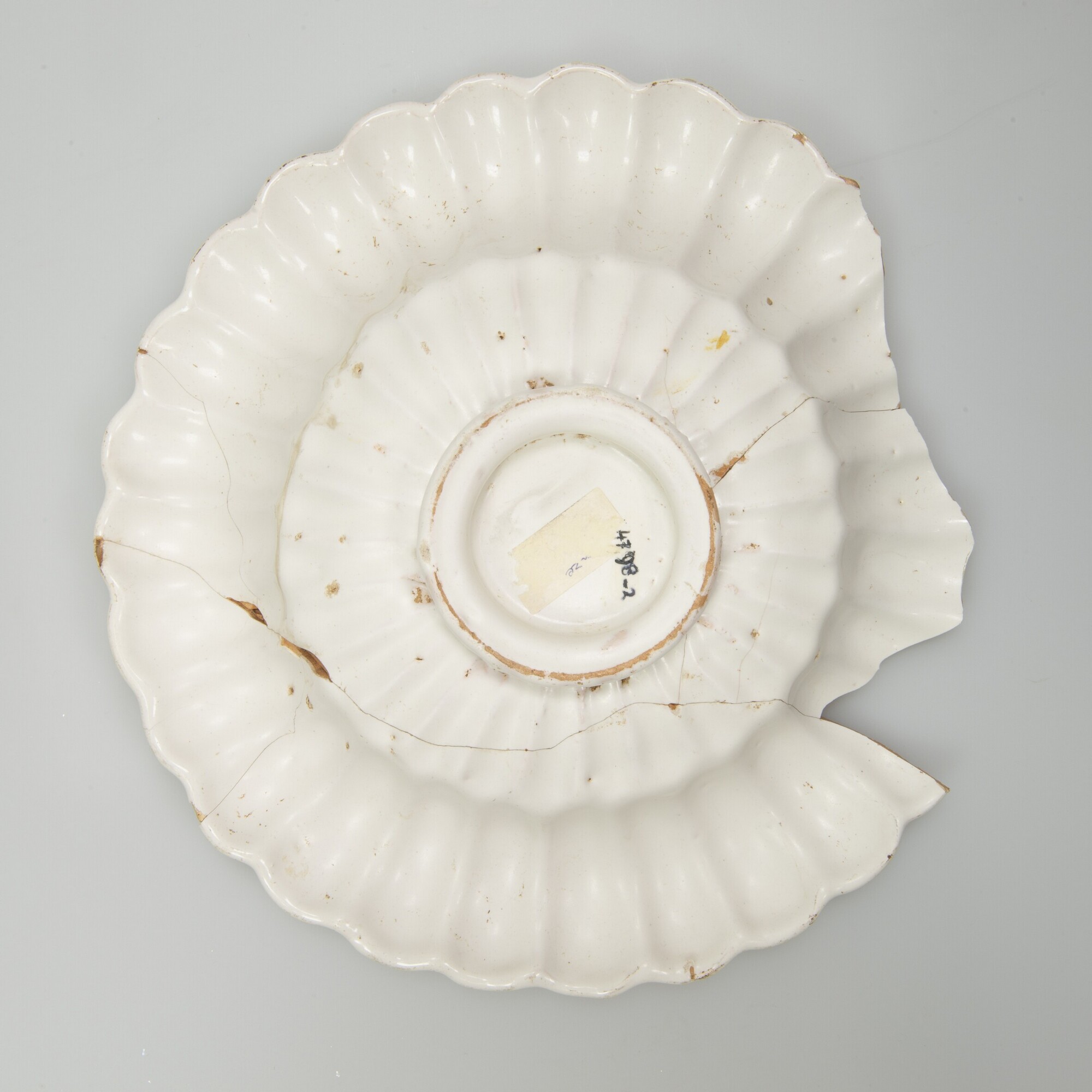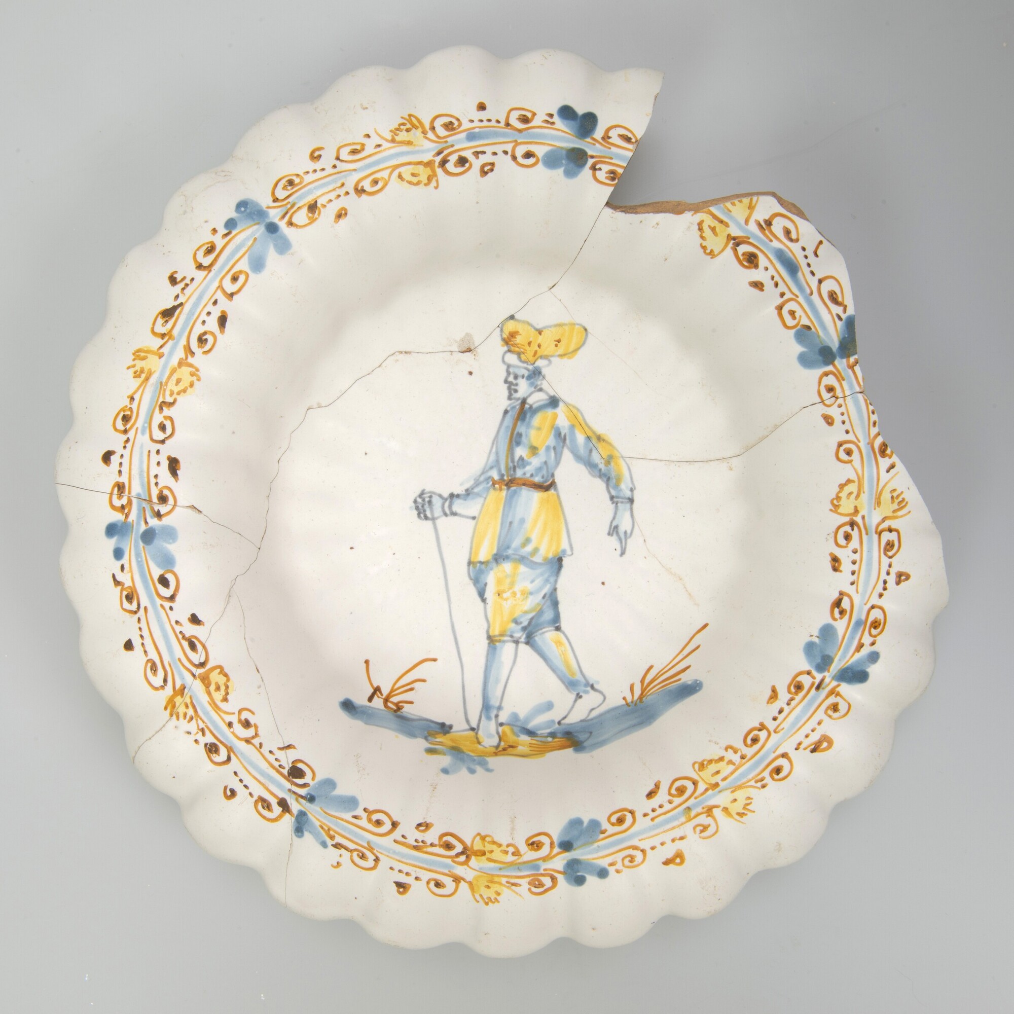 Plooischotel; fr-plo-1; plooischotel met ver uitgebogen vlag met knik afgezet, vlag en buitenrand spiegel geplooid, standring; Franse faience; tinglazuur; inwendig polychrome beschildering: spiegel: chique geklede man met wandelstok, vlag: aigretterand of krabbenpoten in oranje en blauw; herkomst: Nevers, Frankrijk