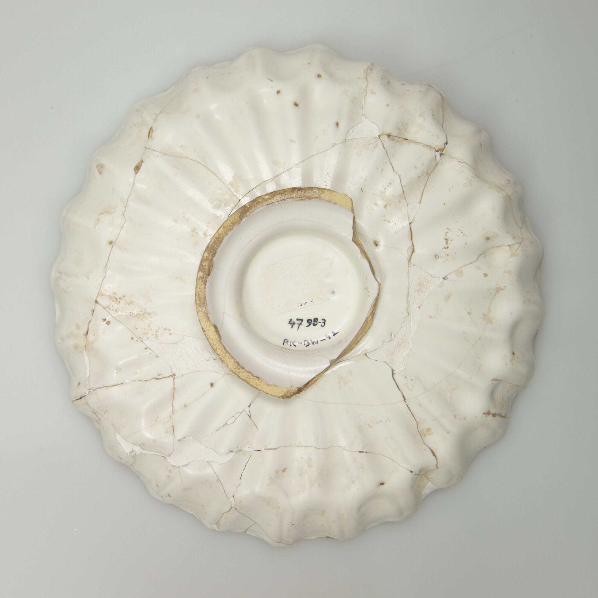 Plooischotel/crespina; i-plo-3; komvormige plooischotel, vlag en overgang vlag-spiegel geplooid; Italiaans faience; in- en uitwendig tinglazuur; spiegel: landschap met rots waarachter gebouwtje, vlag: aigretterand of krabbenpoten, alles in blauw en oranjegeel; standring; herkomst: Italië