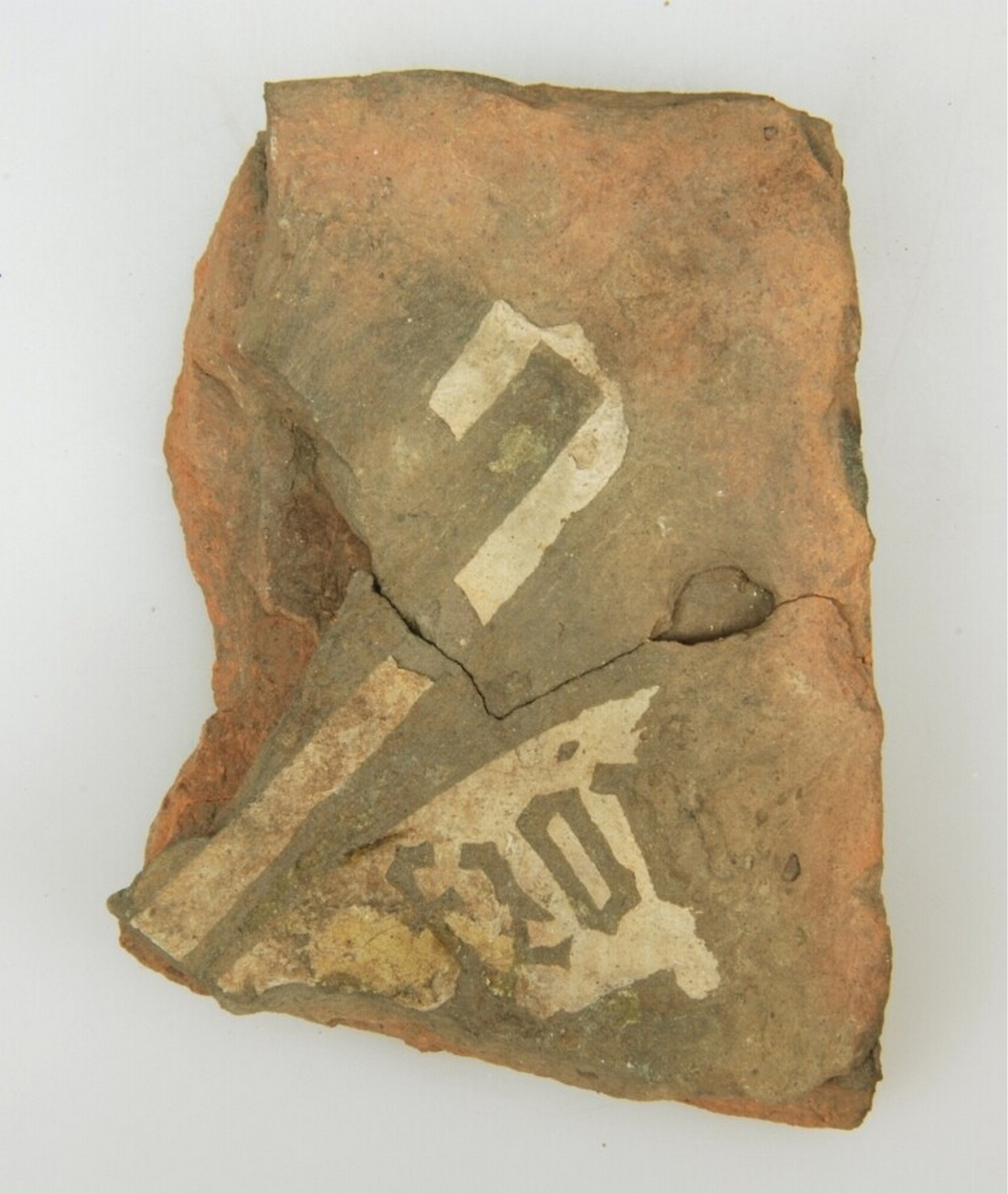 Plavuis; roodbakkend aardewerk; bovenzijde loodglazuur (grotendeels weggesleten); slibversiering: banderol met gotische tekst; herkomst: Nederlanden
