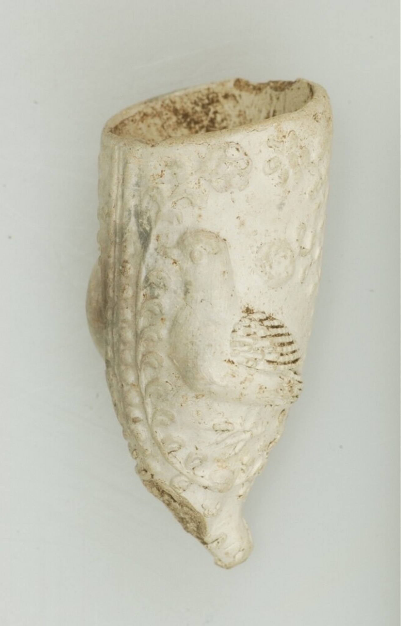 Kleipijp; trechtervormig model met op de zijden een duif en doffer tussen bloemranken. De vormnaad is met een parelrand afgewerkt en de ketel heeft een spoorvormige hiel