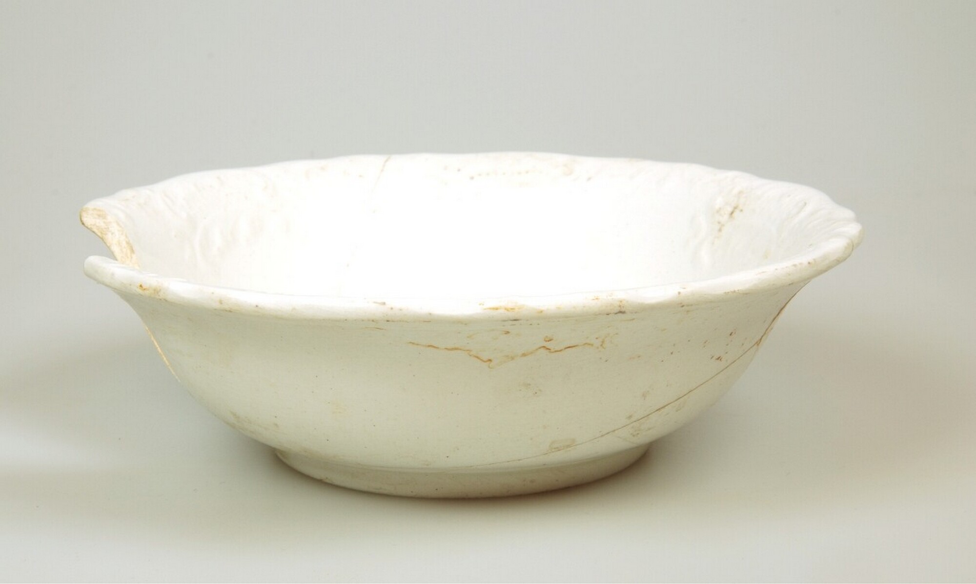 Kom; iw-kom-; industrieel wit; loodglazuur; standring; blindmerk: 6; herkomst: Engeland ?