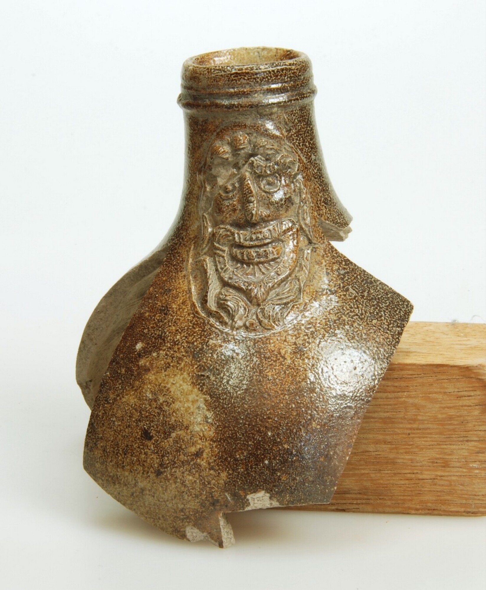 Kan; s2-kan-47; steengoed; uitwendig zoutglazuur; baardmanmasker; standvlak; verticaal worstoor; herkomst: Duitse Rijnland (Frechen?) vondstgegevens: volgnr.: 301, cat.nr.: 1/508, datum: 2005