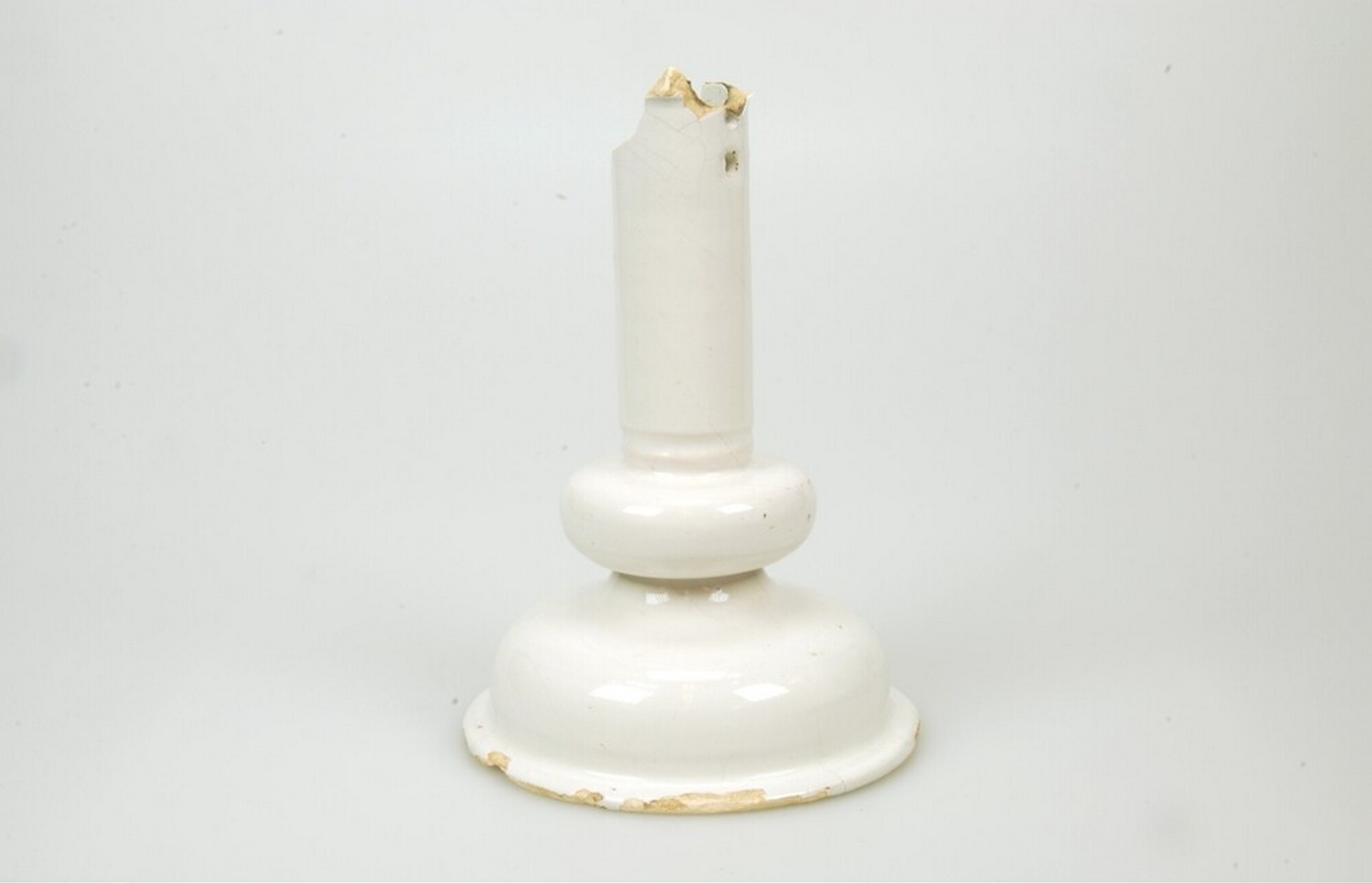 Kandelaar; f-kdl-1; Nederlands faience; tinglazuur; wit; holle voet; twee gaatjes in de kop; herkomst: Delft