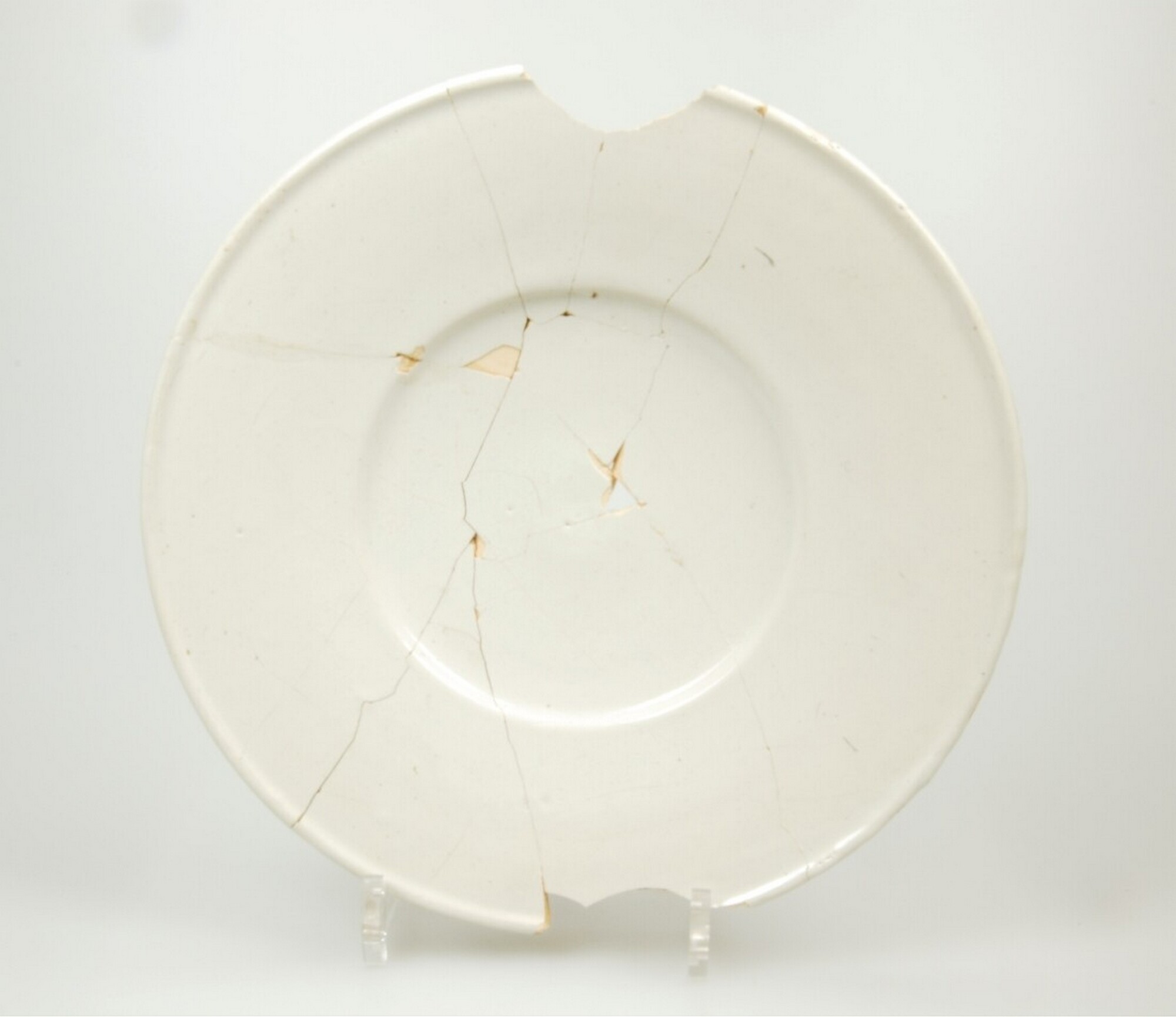 Bord; f-bor-19; plat bord met platte spiegel, zeer brede vlag inwendig met knik afgezet; Nederlands faience; voor- en achterzijde tinglazuur; wit; standvlak; Delft
