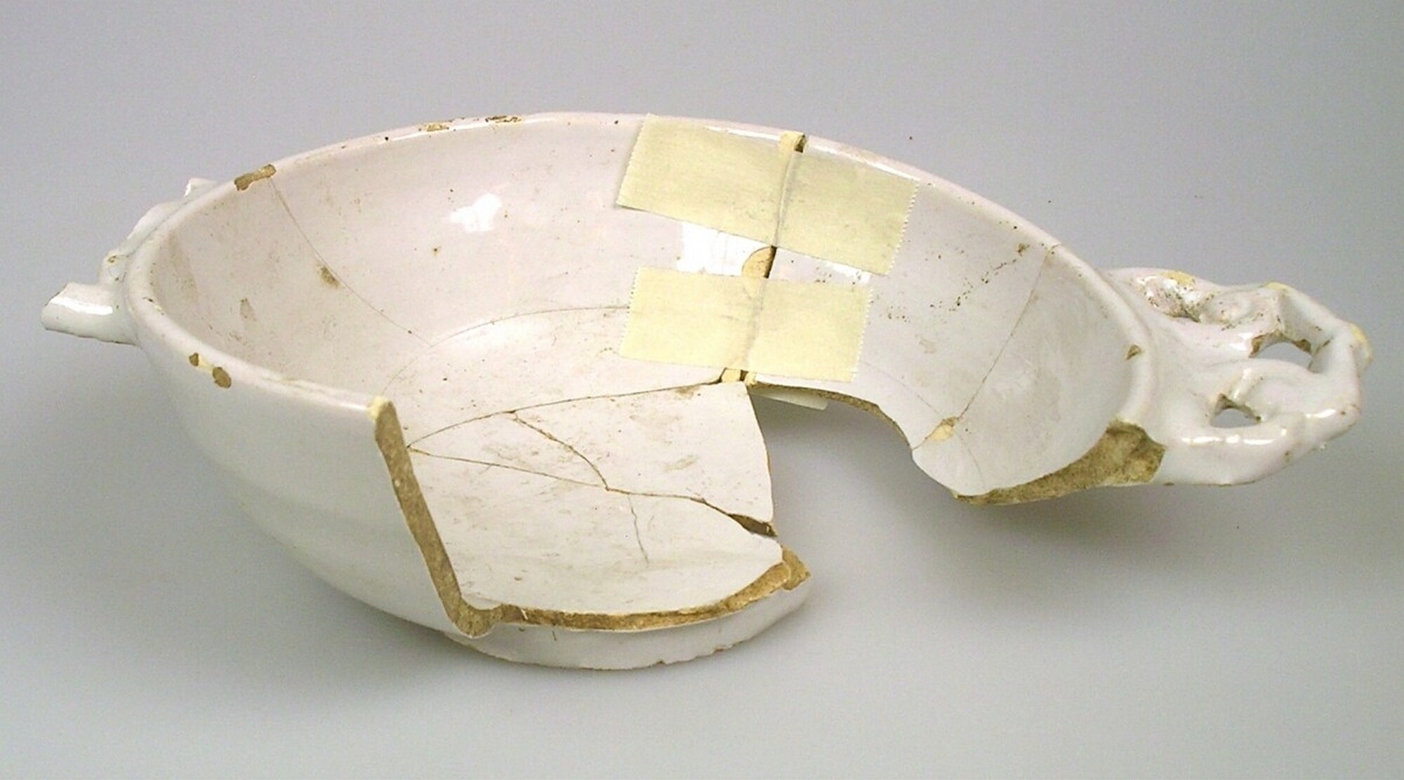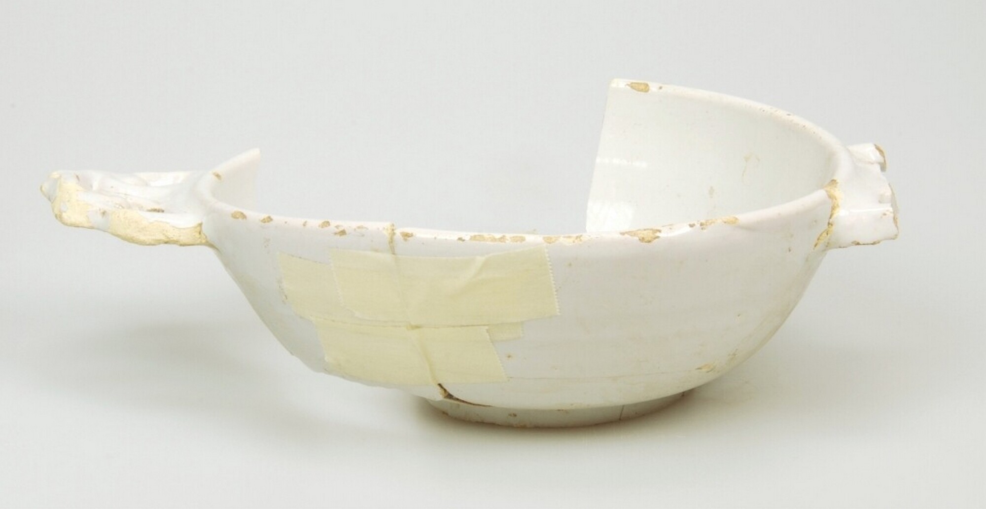 Papkom/brandewijnkom; f-kom-10; Nederlands faience; in- en uitwendig tinglazuur; wit, standring; twee platte oren; relief op oren, gat in oren; herkomst: Delft