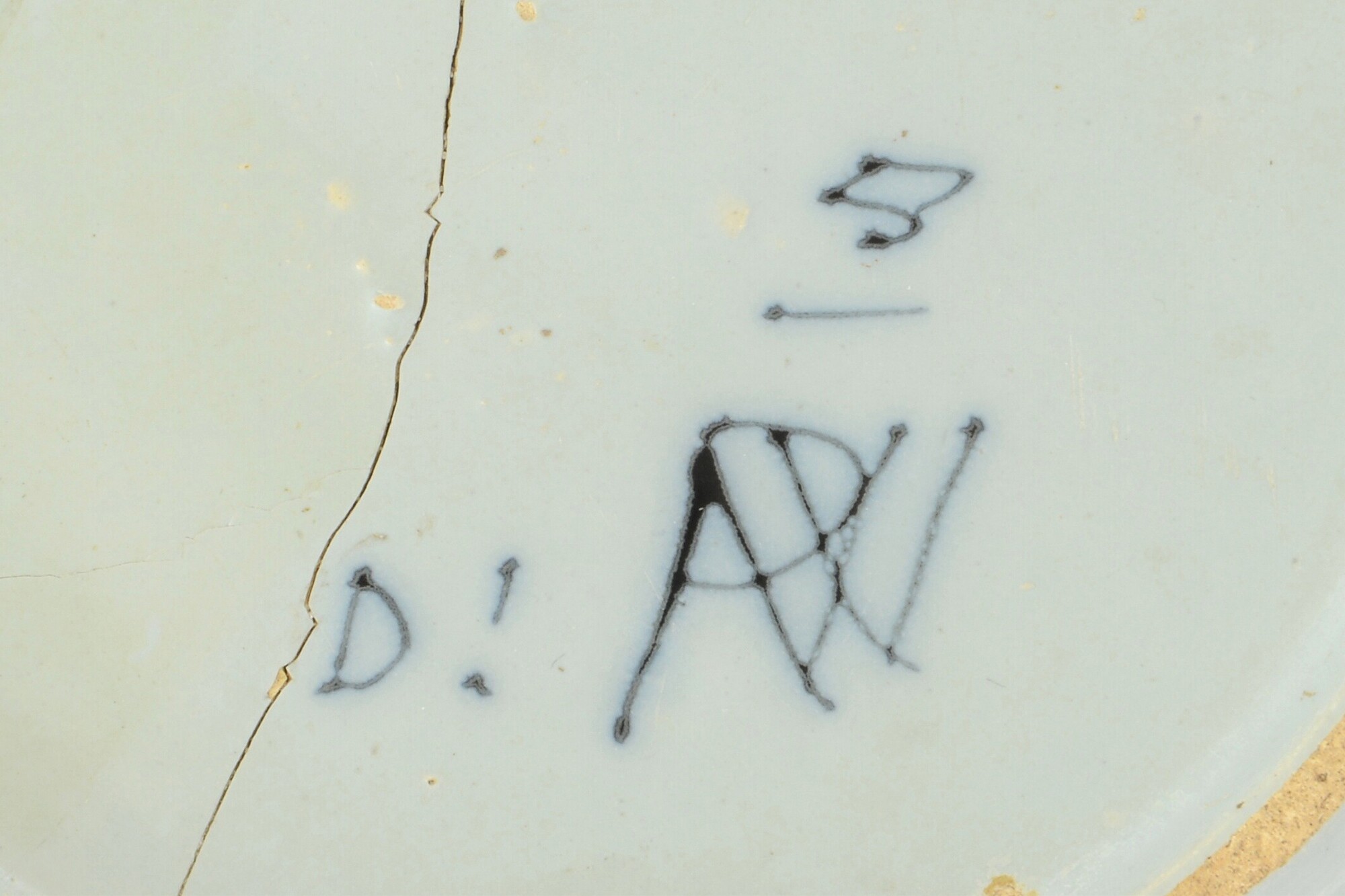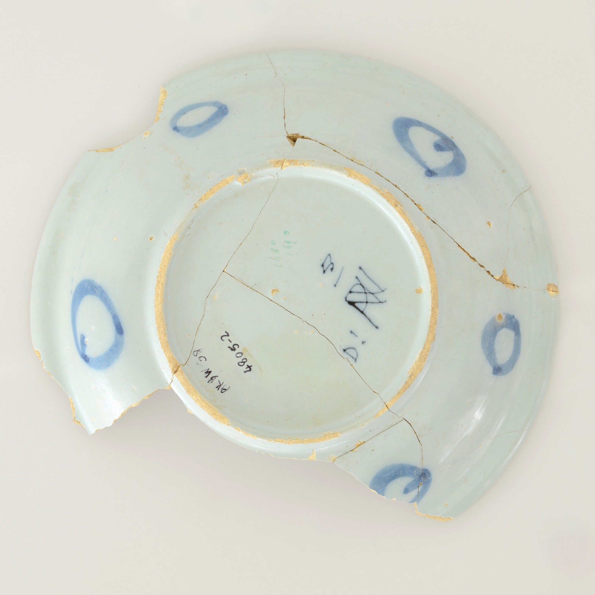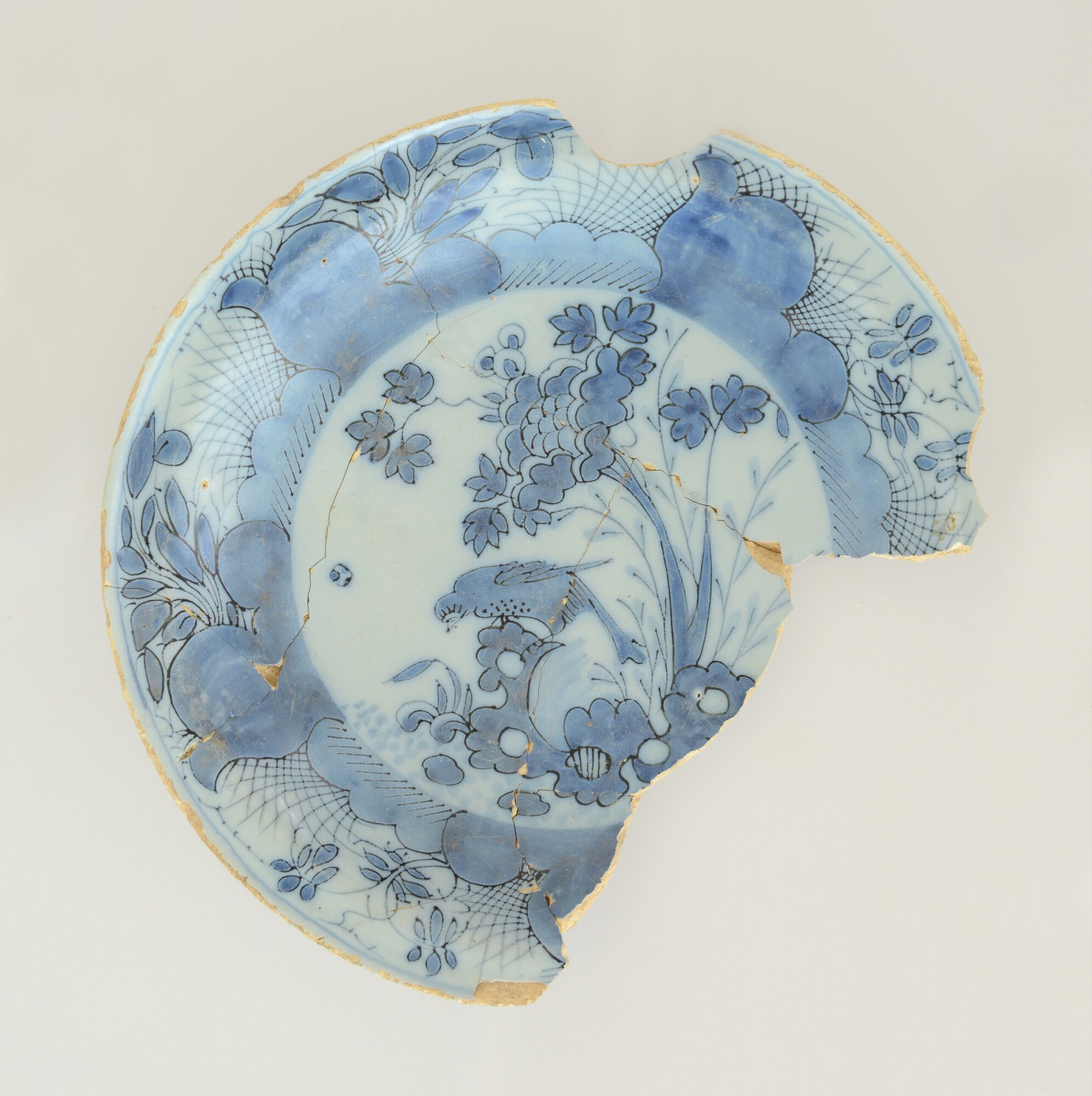Bord; f-bor-7; bord met naar buiten geknikte vlag; Nederlands faience; voor- en achterzijde tinglazuur; spiegel: Chinese tuin; vlag: rotsen en riet, merk onderzijde; De pauw en nummer 5, alles in blauw op wit; standring; herkomst: Delft, plateelbakkerij ''De Pauw''