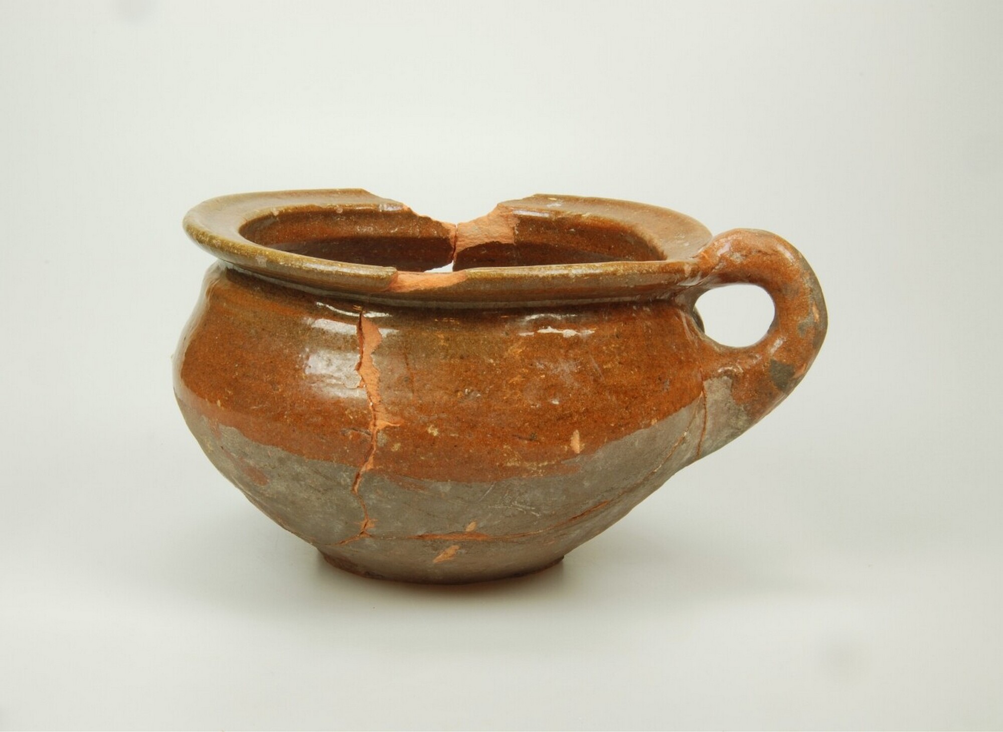 Pispot; r-pis-32; roodbakkend aardewerk; in- en deels uitwendig loodglazuur; standring; verticaal worstoor; bodem scheef afgesneden; herkomst: Nederland