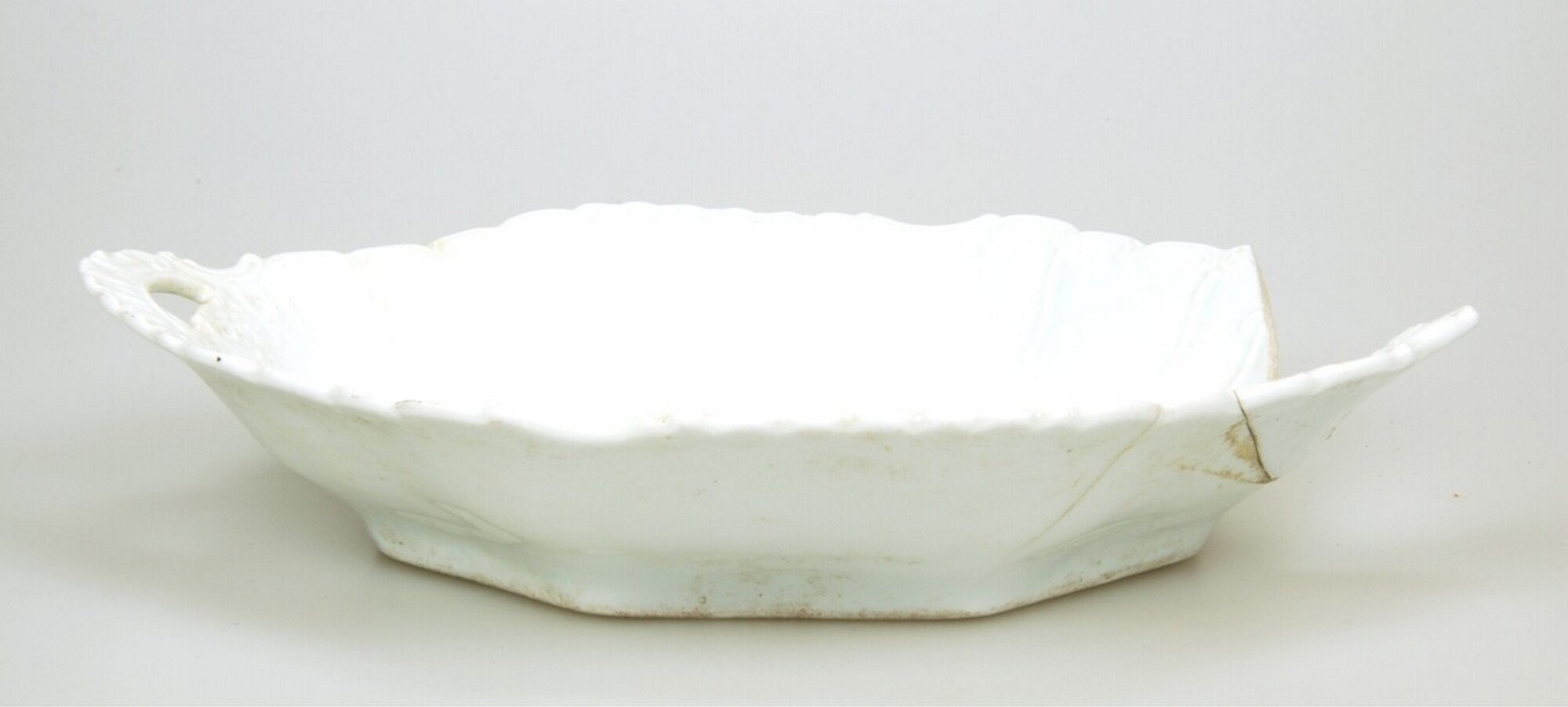 Schaal; ep-kom-; Europees porselein; veldspaatglazuur; krullen-/rankenmotief; standring; horizontaal vormoor; herkomst: Schlackenwerth 15, PL Geschutzt S; fabriek van Pfeiffer & Lowenstein te Schlackenwerth (Bohemen)