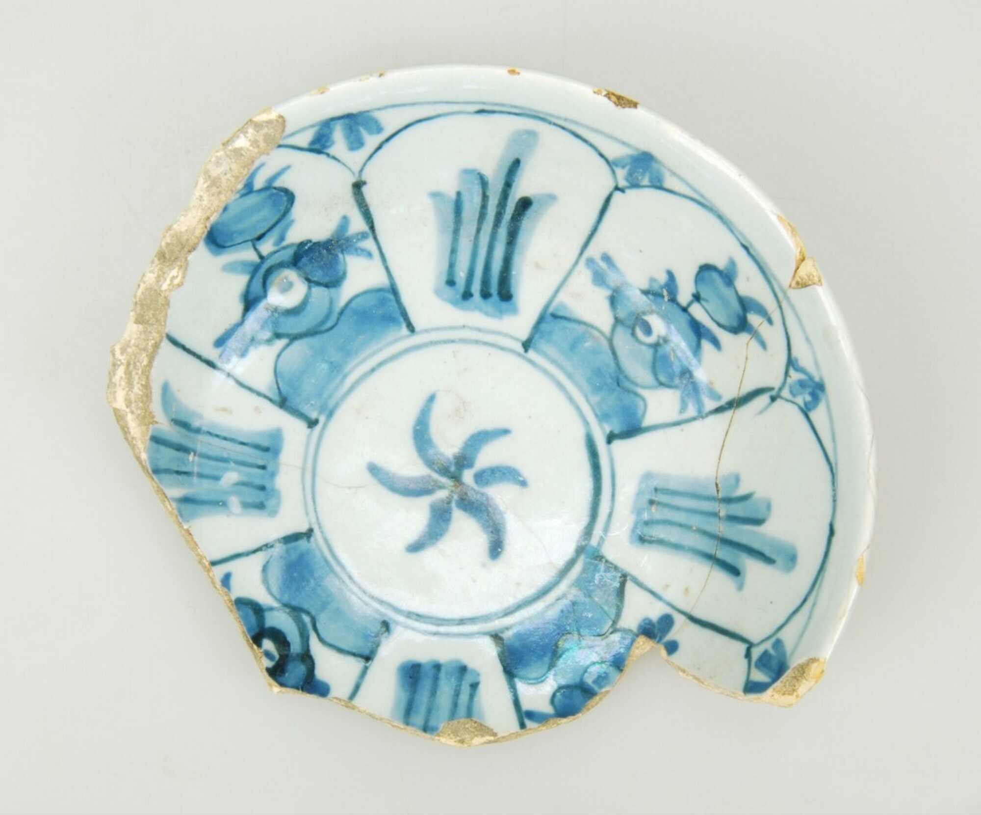 Bord; f-bor-16; diep hol bord met uitgebogen lip; Nederlands faience; tinglazuur; spiegel: ster binnen dubbele cirkel, vlag: acht vakken met florale motieven; standring; herkomst: Delft