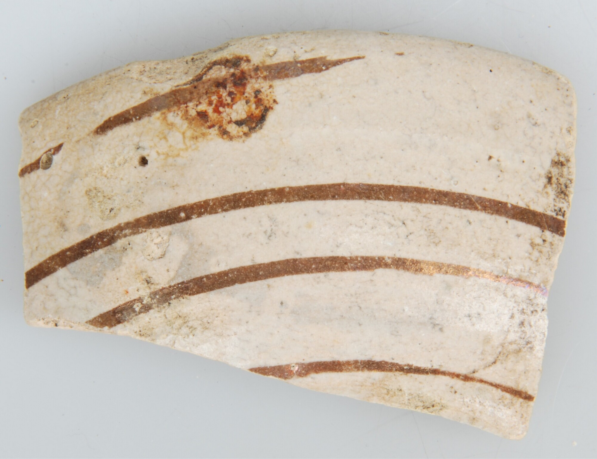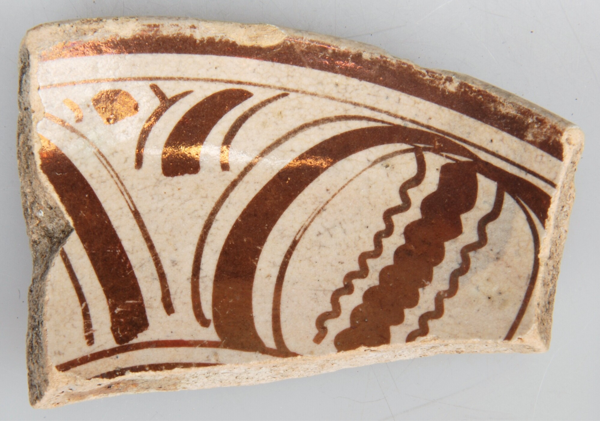 Kom; sp-kom-1; Spaans tinglazuuraardewerk (goudlustermajolica); rood baksel; geometrische motieven in goudluster; herkomst: Spanje