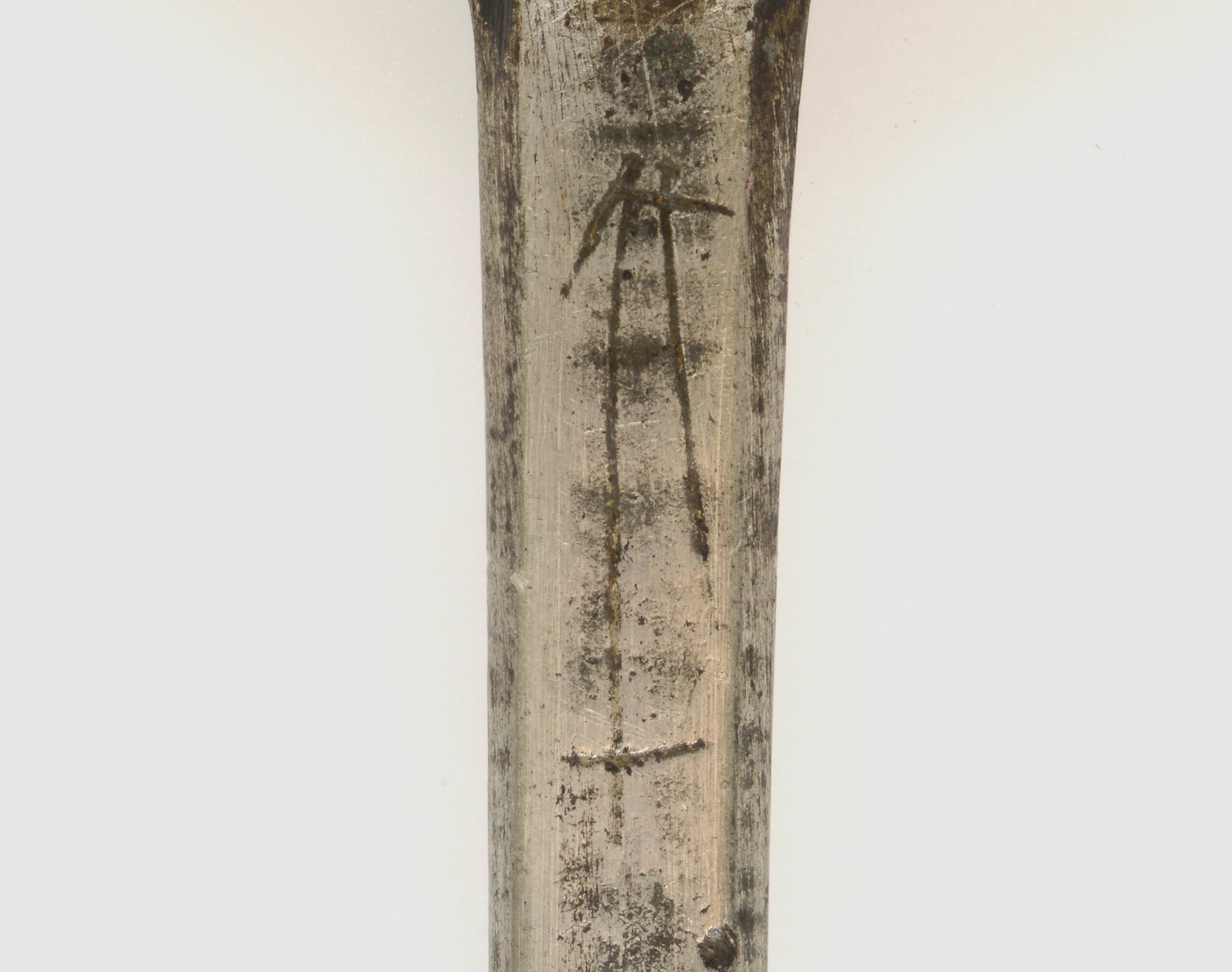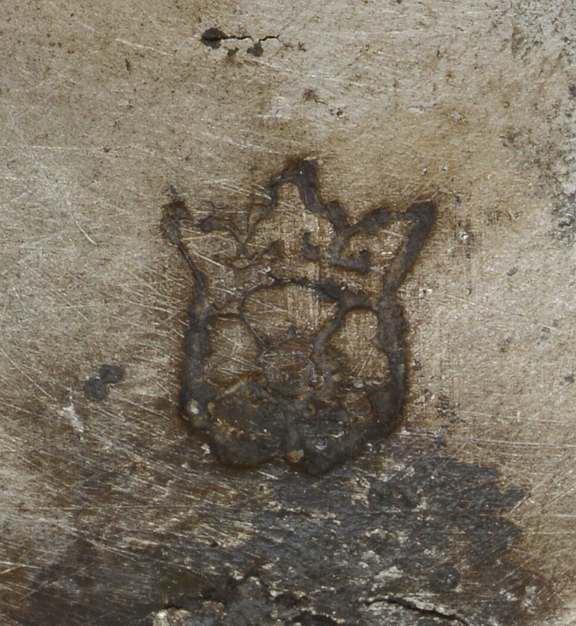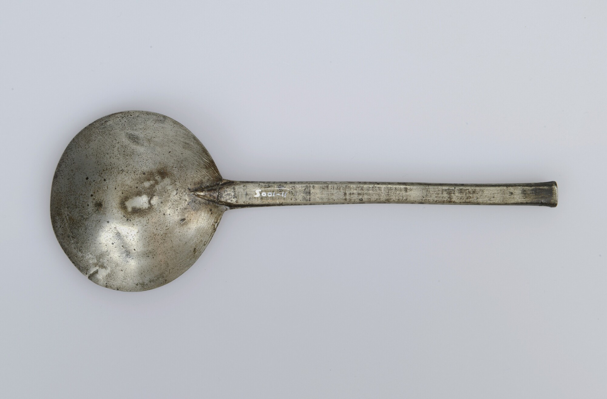 Lepel; lepel met ronde bak, zeshoekige steel, steel verdikt aan het uiteinde; merk gekroonde roos in de bak bij aanzet steel; huismerk op de steel; vondstdatum: 02-10-1934