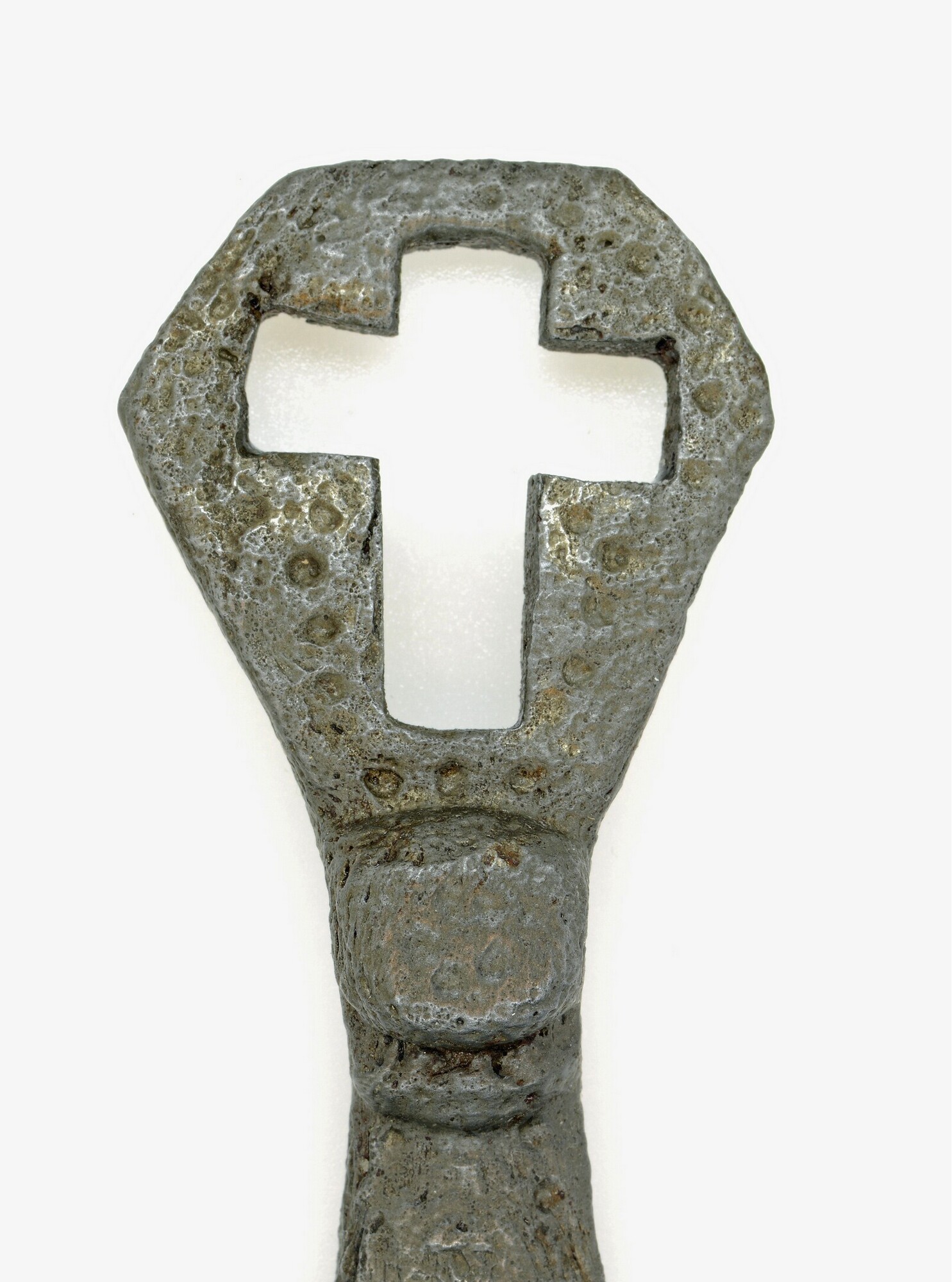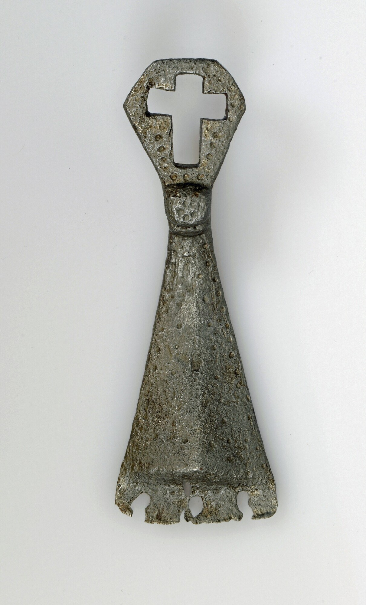 Neusbeschermer; onderdeel helm; langwerpig trapeziumvormig; smal in het midden met een vierkante knop en aan beide zijden breder uitlopend; aan het onderste uiteinde bevinden zich drie gaten, aan de bovenzijde een opening in kruisvorm; rondom de opening, op de knop en op het onderste deel een patroon van geslagen ronde putjes ter decoratie; vondstdatum: 29-09-1934