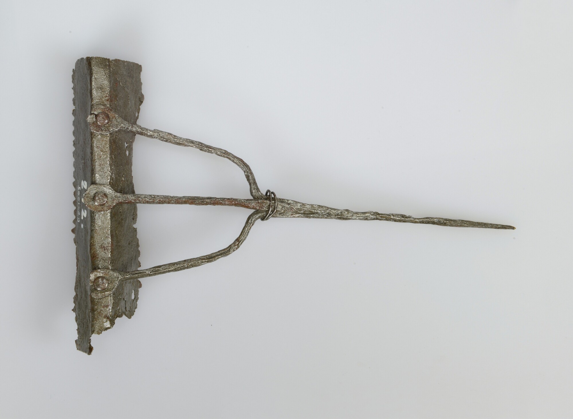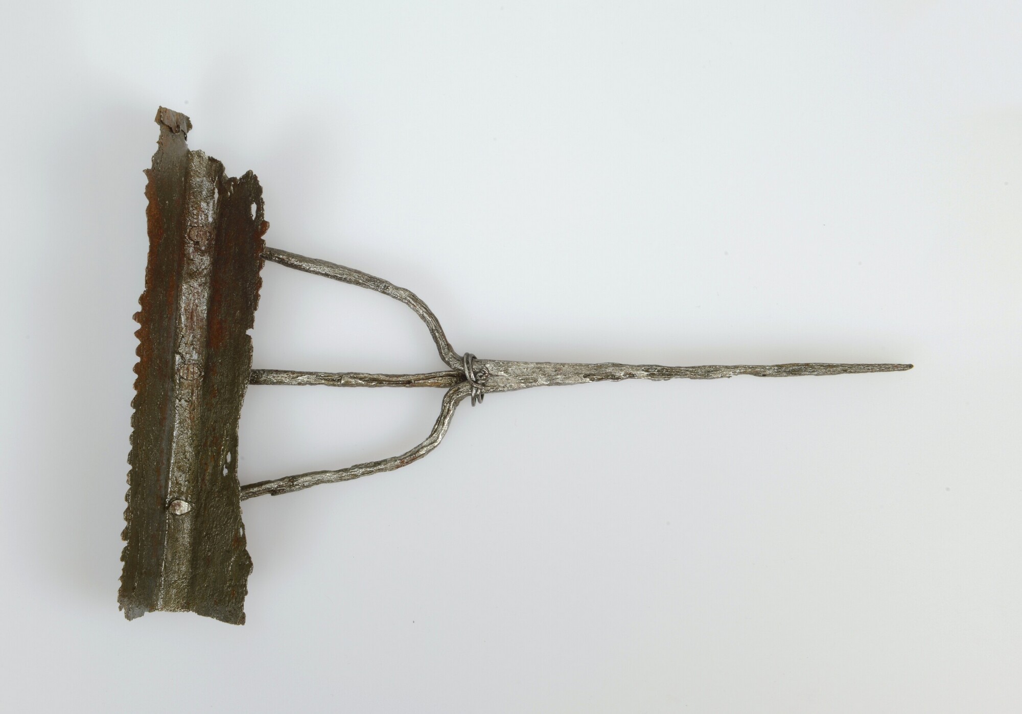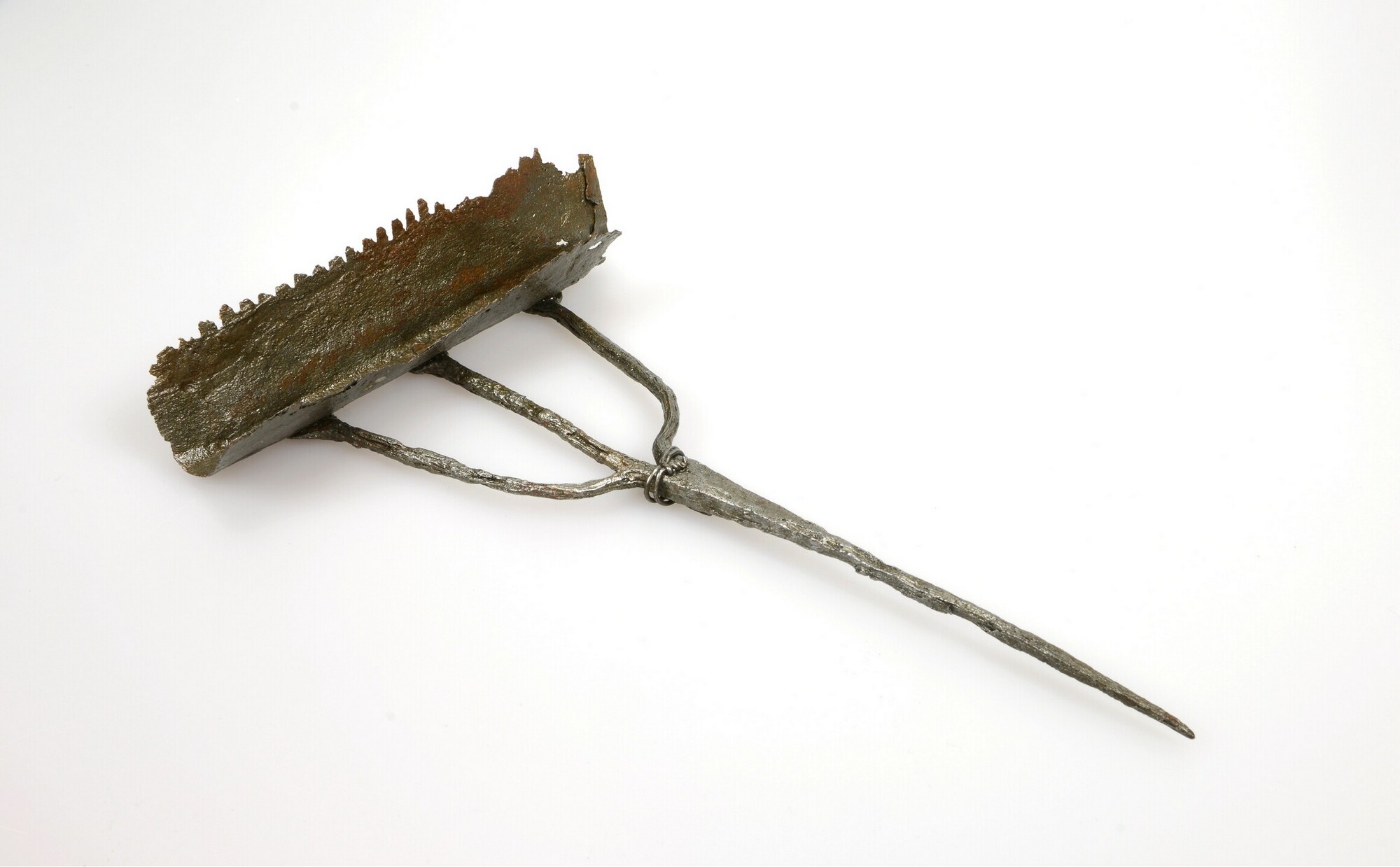 Roskam; langwerpige plaat; halfrond gebogen, waarin tanden zijn gezaagd, (grotendeels weggesleten), steel, uitlopend in drie armen die boven aan de plaat bevestigd zijn met nagels; gerepareerd met een ijzerdraadje; vondstdatum: 07-10-1935