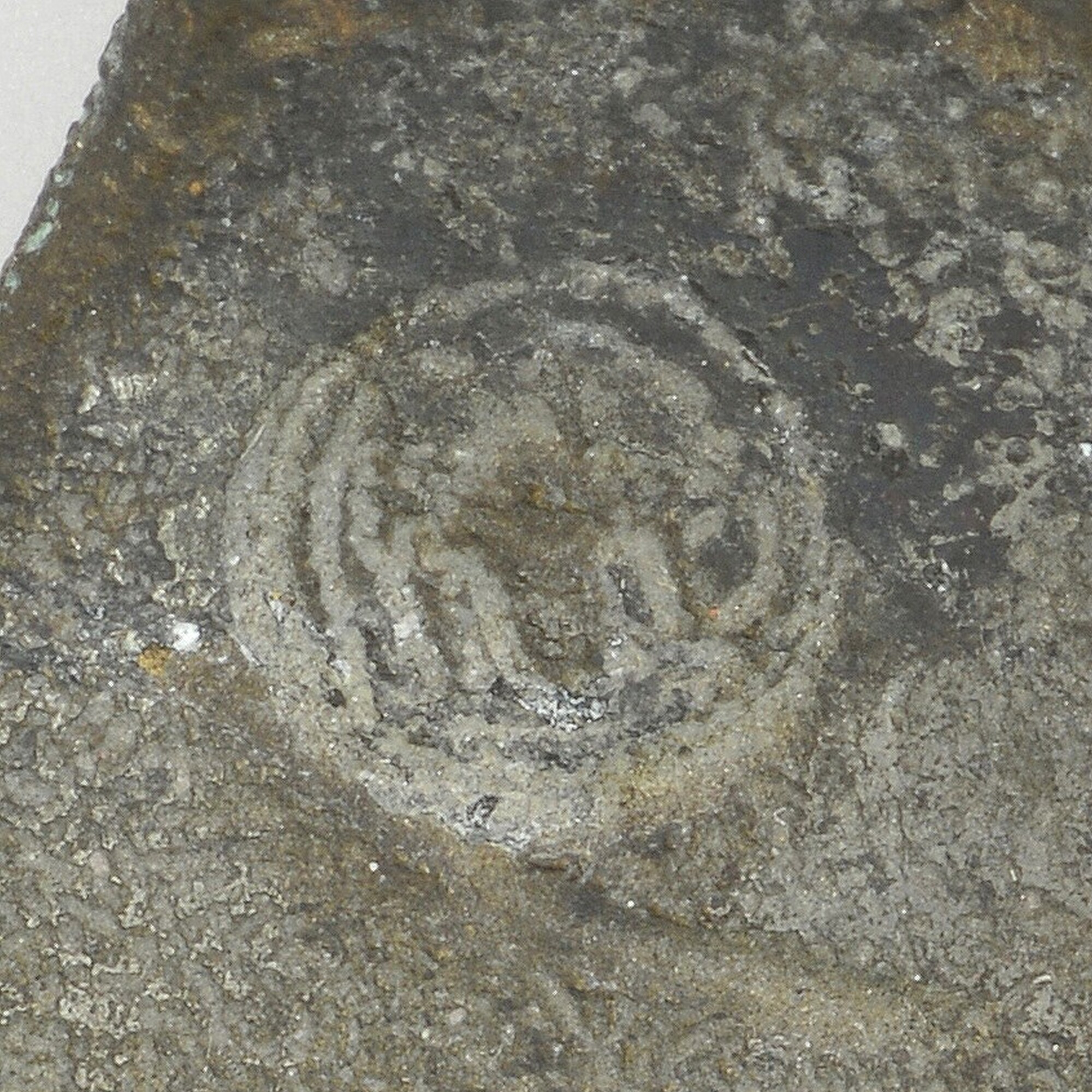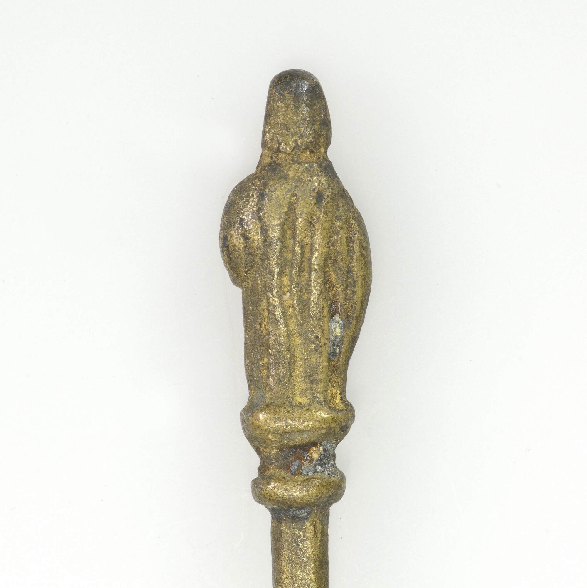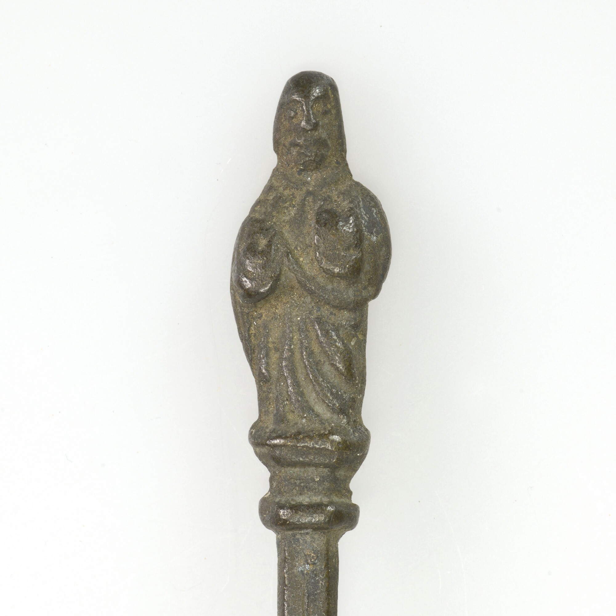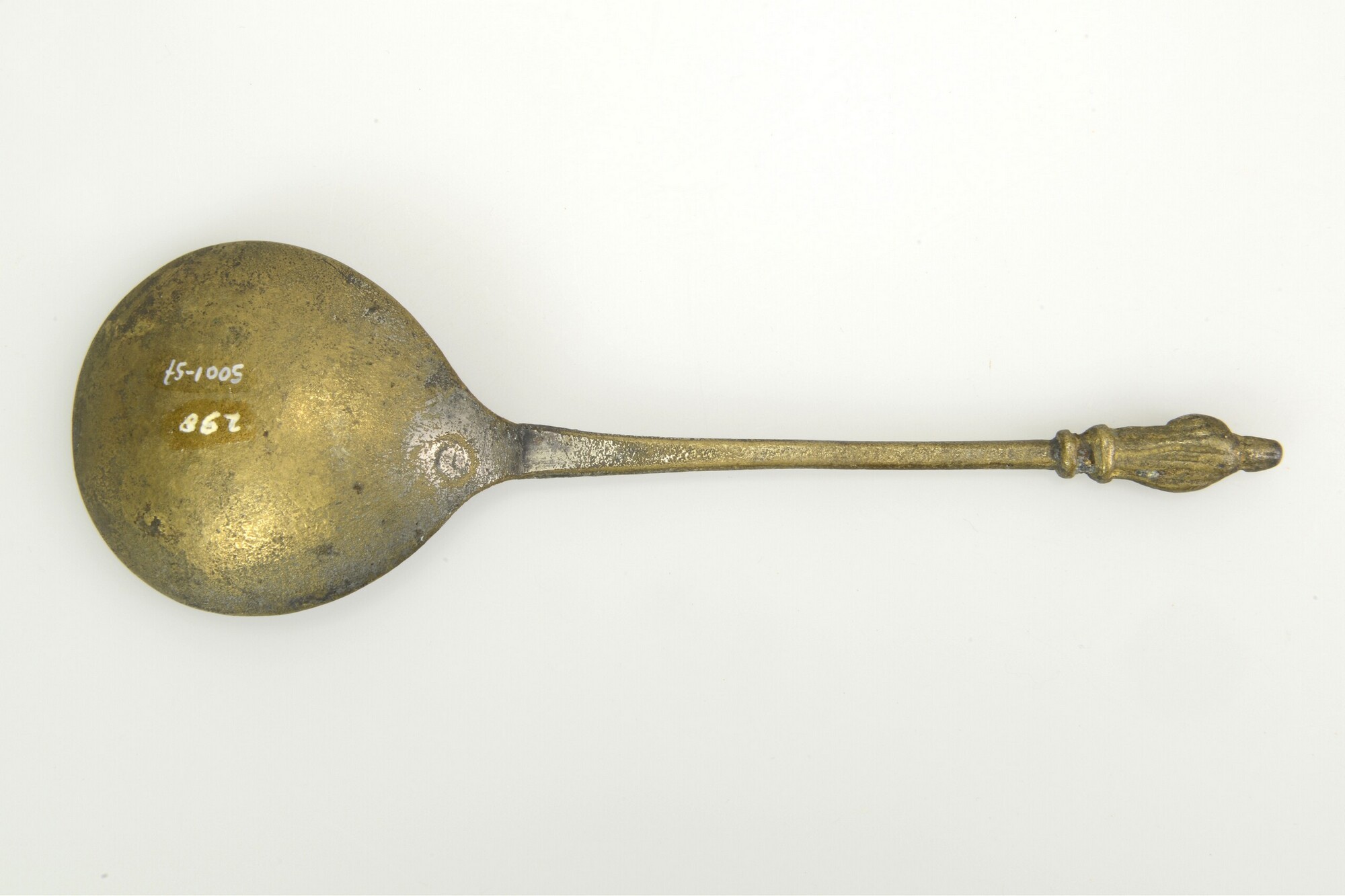 Apostellepel; vijgvormige bak en platte steel met lijn op voorzijde. De steel is rechthoekig in doorsnede en heeft een groef aan de voorzijde; merkteken in de bak bij de steel; herkomst: Engeland?