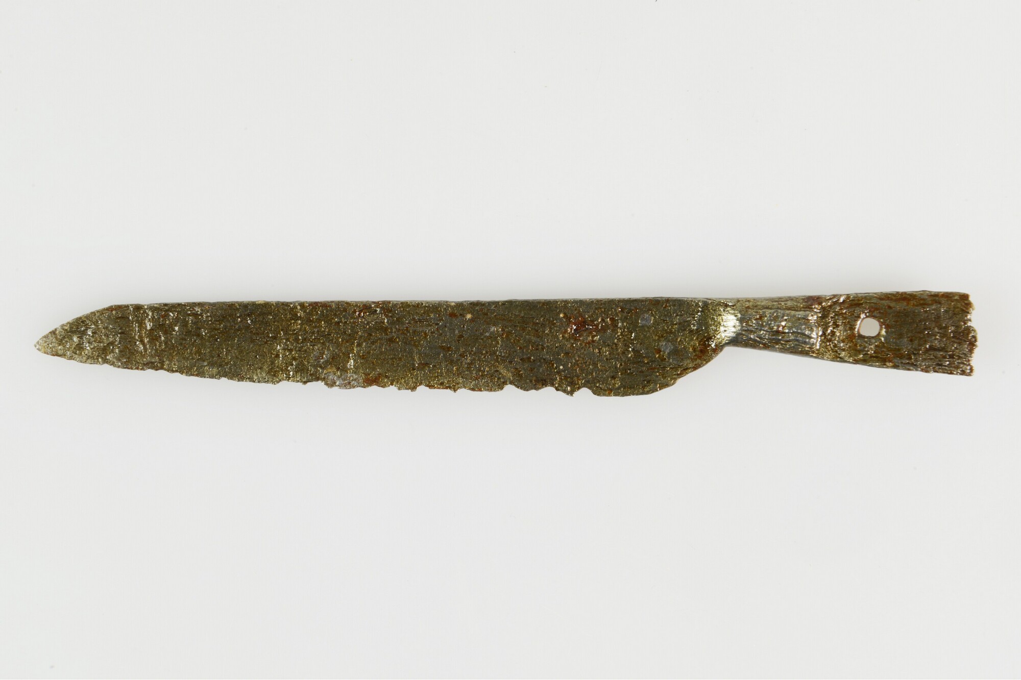 Mes; fe-mes-; plaatangel met een gat en aangesmede heftbeschermer; vondstdatum: 25-08-1934