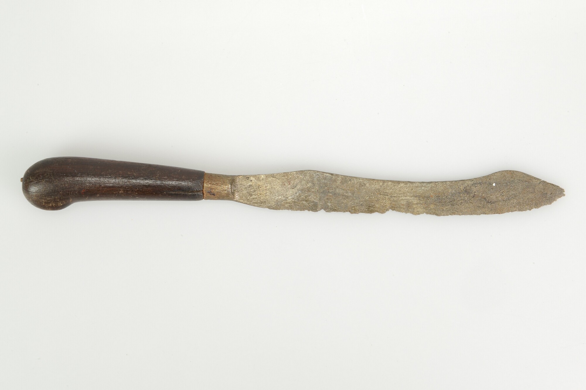 Mes; fe-mes-; houten heft en op het lemmet bevinden zich een merkteken; vondstdatum: 24-08-1934