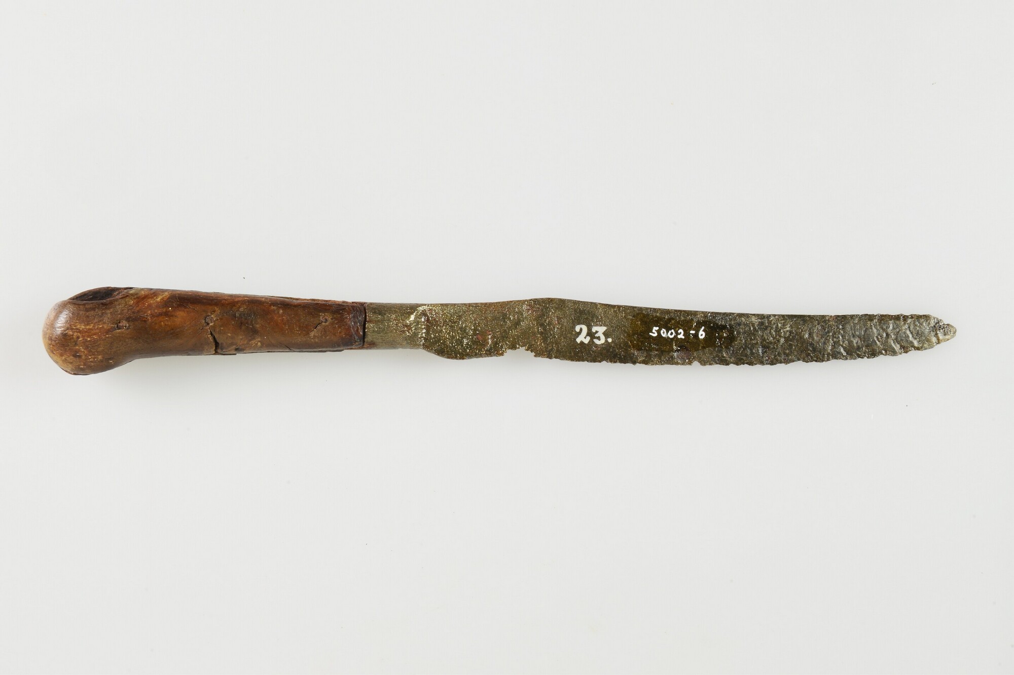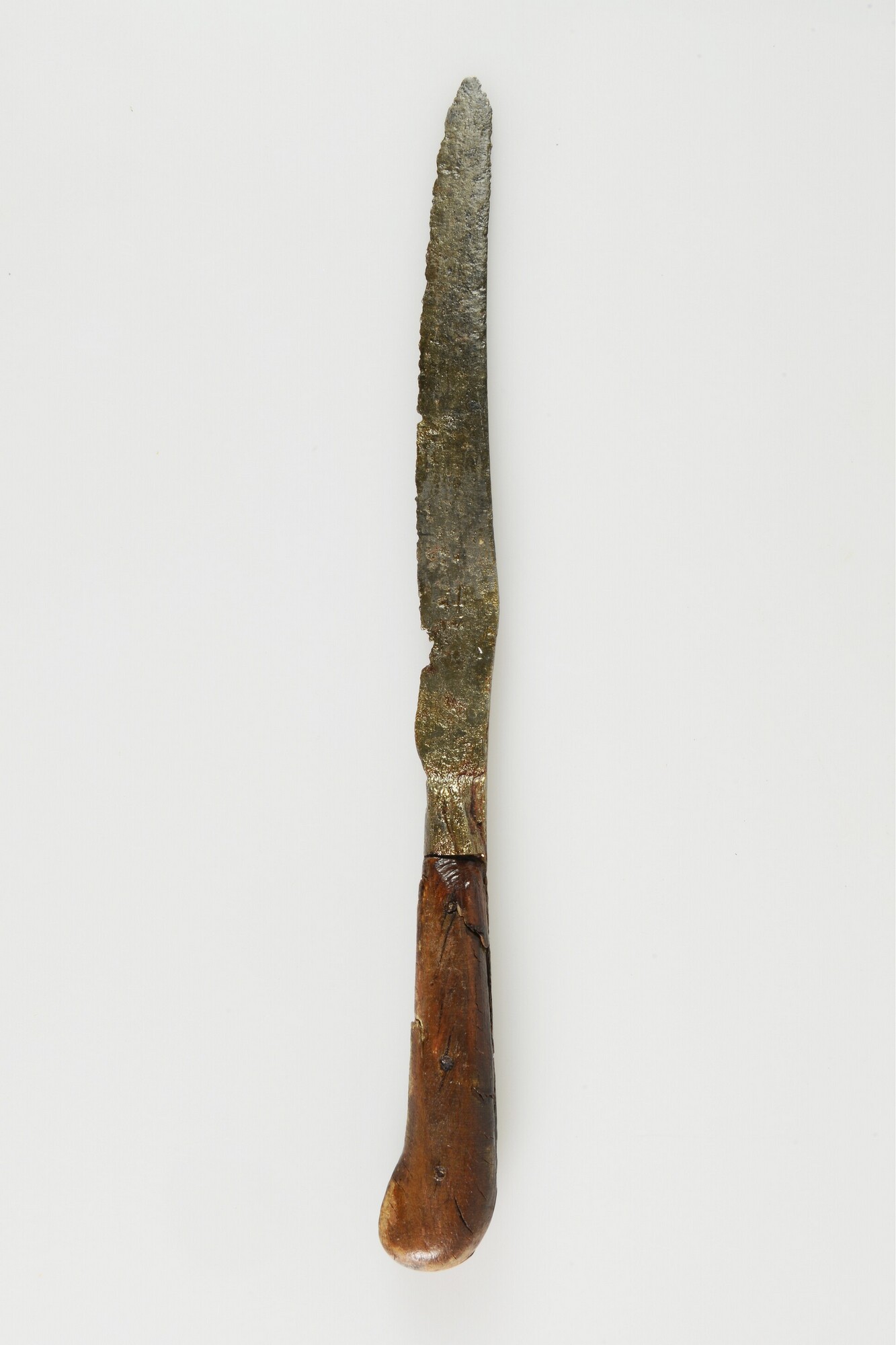 Mes; fe-mes-; plaatangel en houten beslagplaten vastgezet met nagels en aangesmede heftbeschermer, merkteken; vondstdatum: 24-01-1934