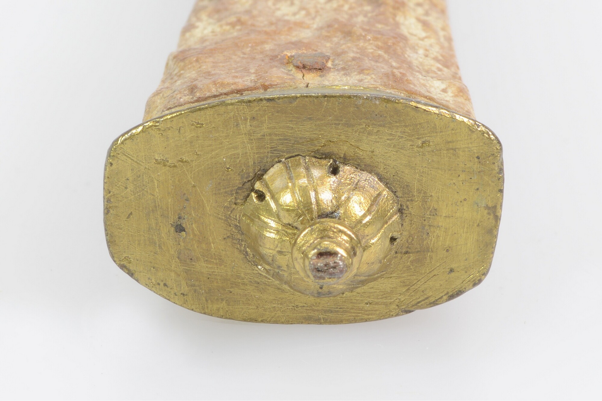 Mes; fe-mes-; Heft bestaat uit aan weerszijden vastgeklonken, met vier ijzeren pennen, rechthoekige, taps toelopende platen en de mesheftbekroning bestaat uit een simpel messing plaat met knopversiering en gravering. Het lemmet loopt taps toe; merkteken; vondstdatum: 18-07-1934