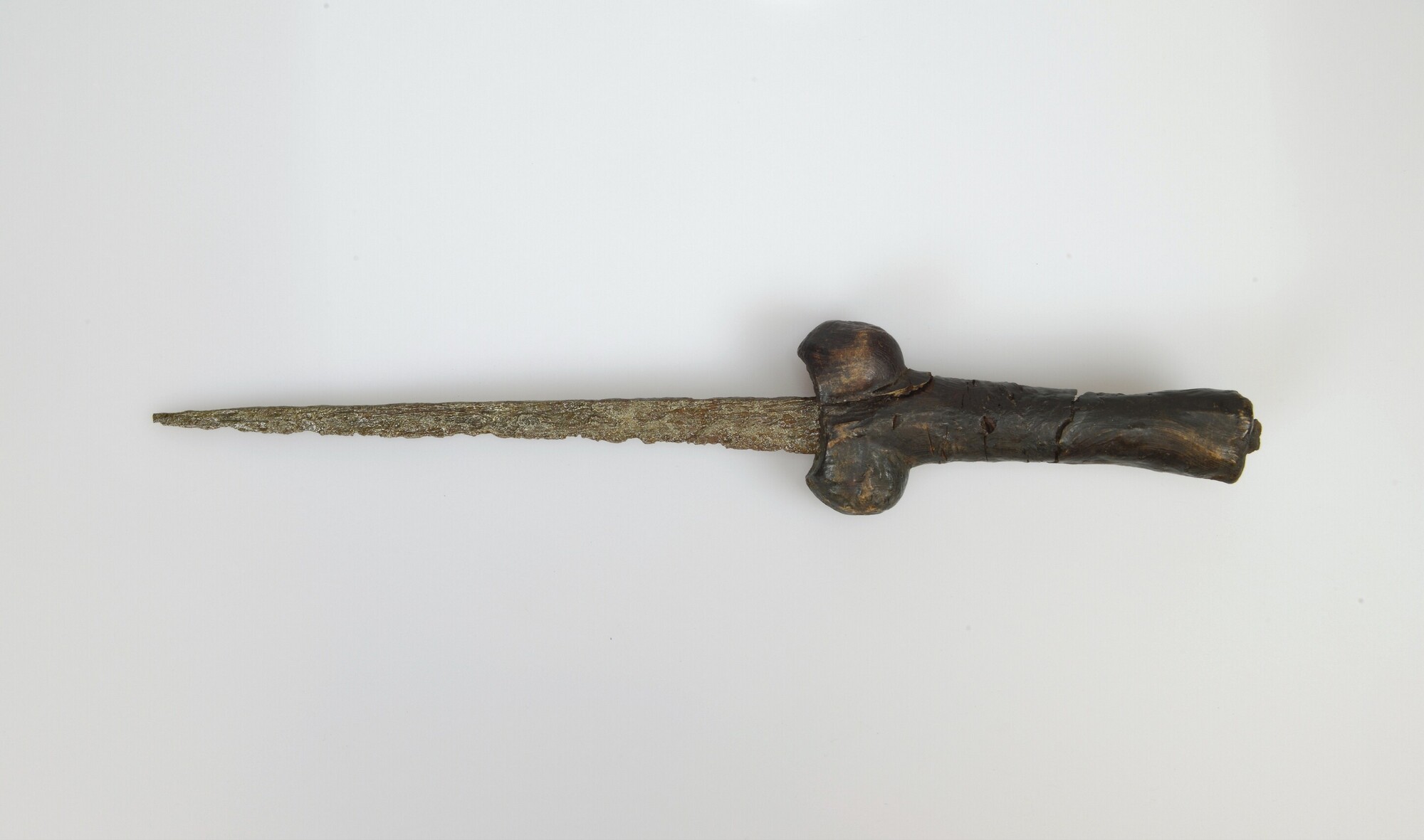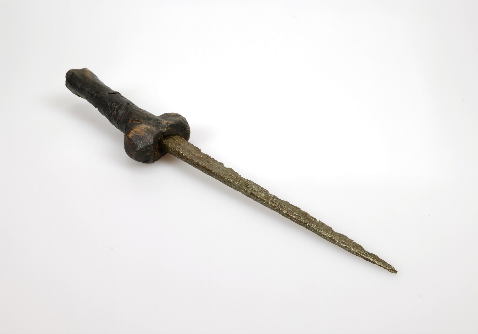 Klootdolk; wortelhouten heft met stootplaat in de vorm van twee houten ballen op een rond lopende metalen basis; het lemmet heeft één snijvlak en is ruitvormig in doorsnede; vondstdatum: 24-09-1934