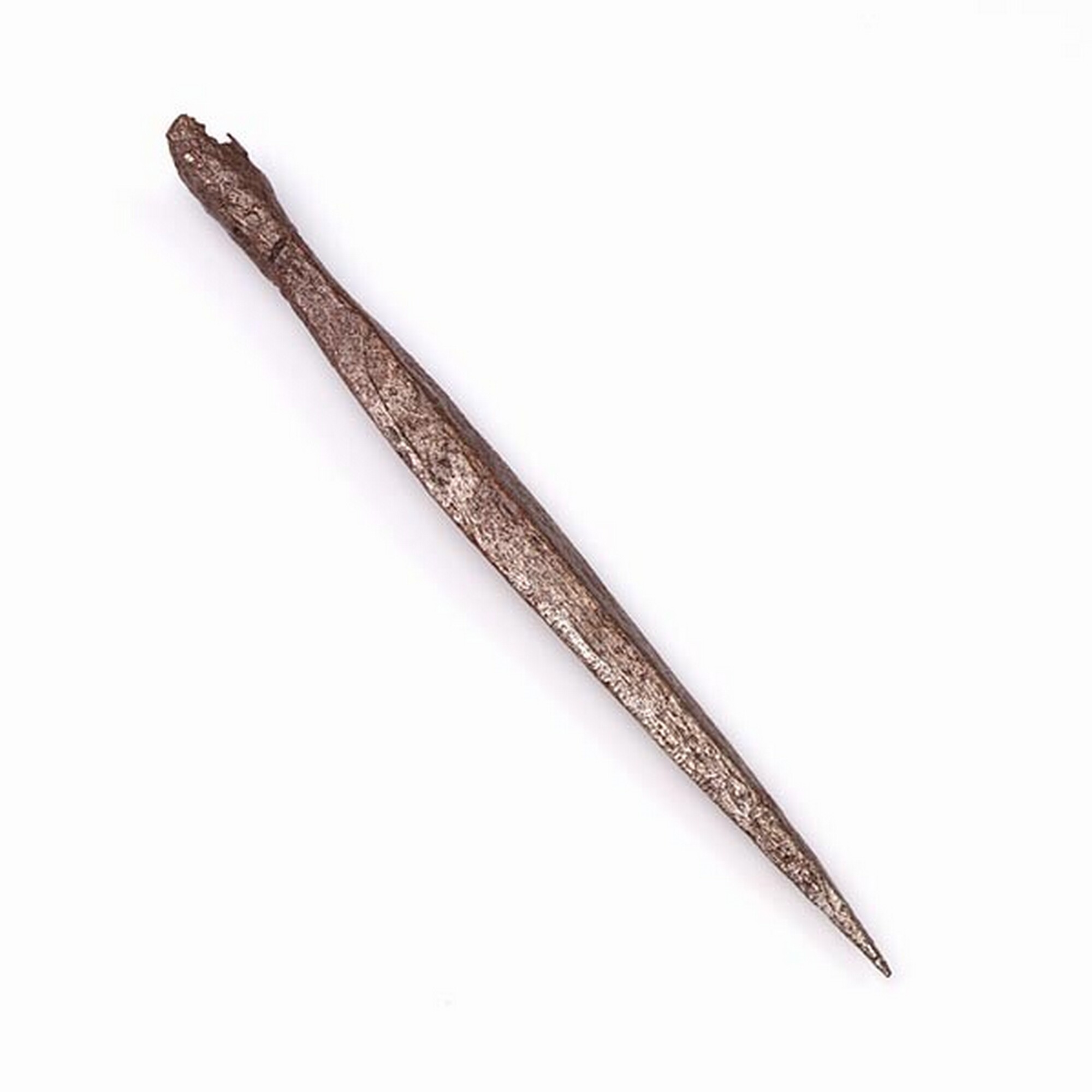 Pijlpunt; doorsnede ruitvormige pijlpunt van een handboogpijl met aangesmede koker; vondstdatum: 02-10-1934