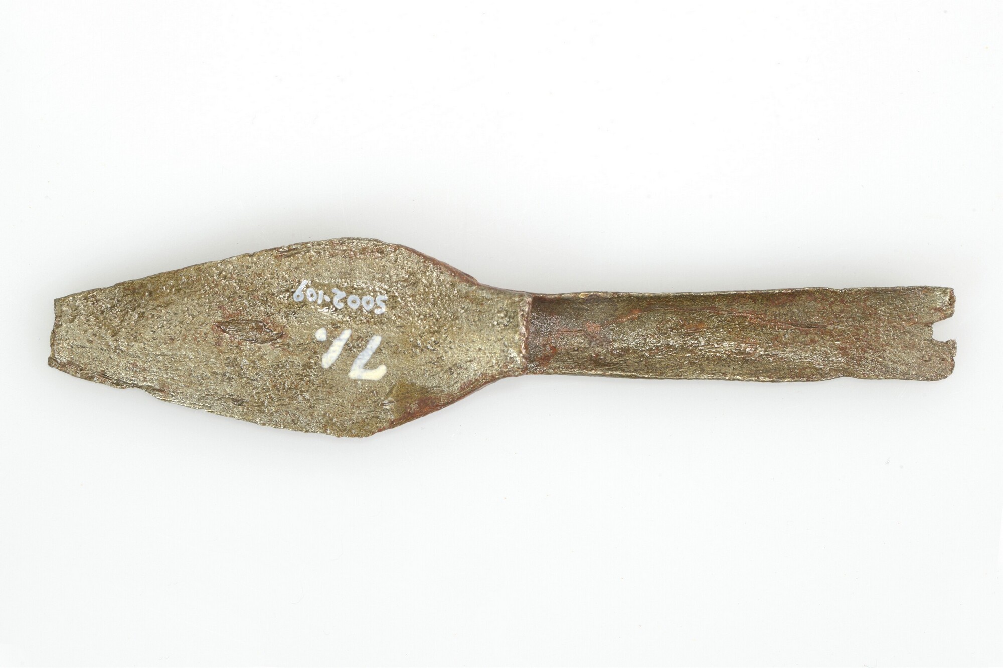 Piekpunt; bladvormige punt en de steel bestaat uit twee uitstaande platen, enigszins hol, waarvan er een is afgebroken; vondstdatum: 12-08-1935