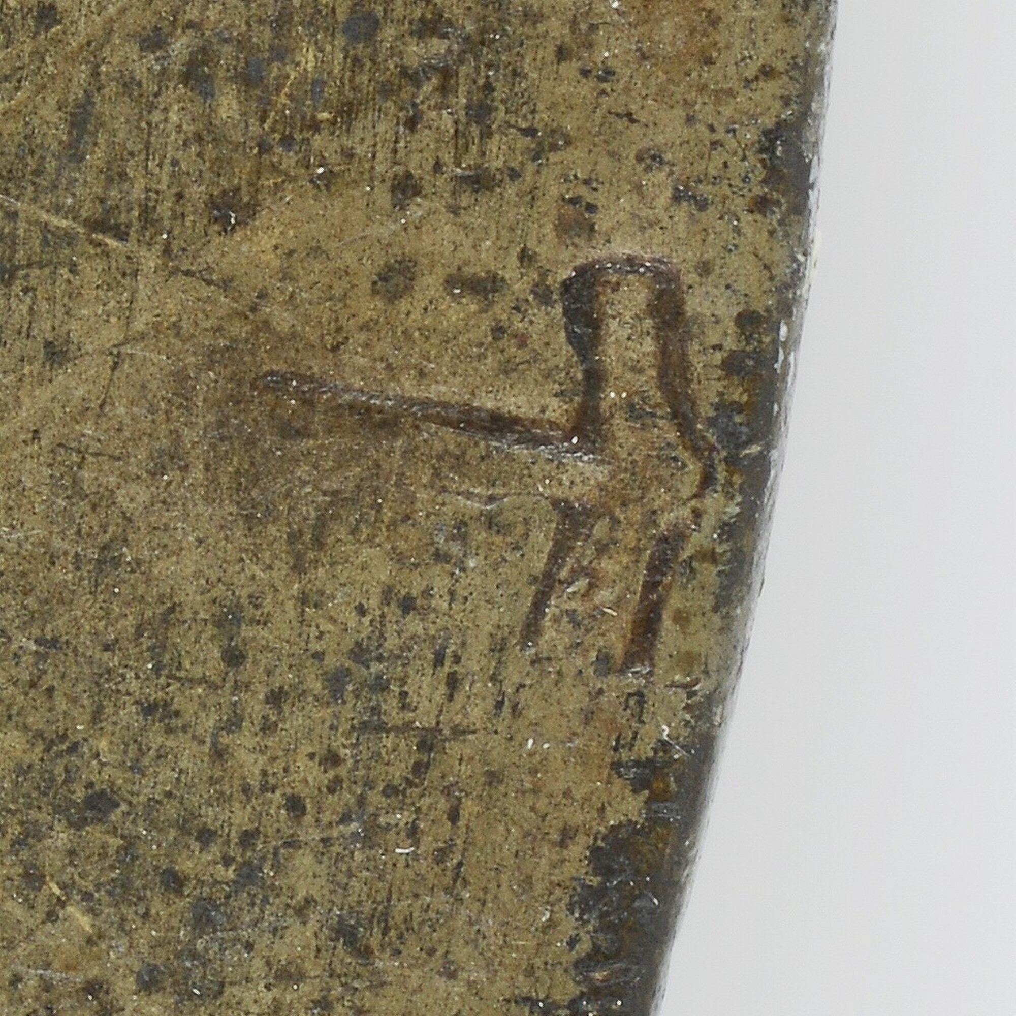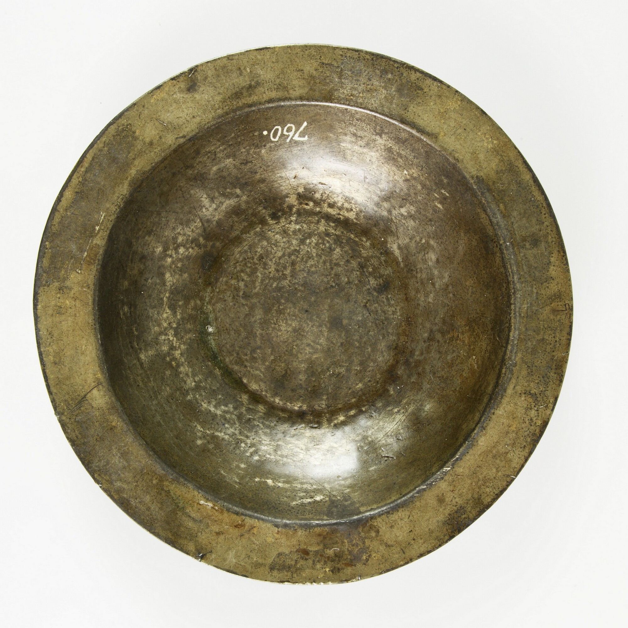 Bord; smalle rand. opstaand profieltje aan de onderzijde, merkteken in rand; vondstdatum: 10-09-1934