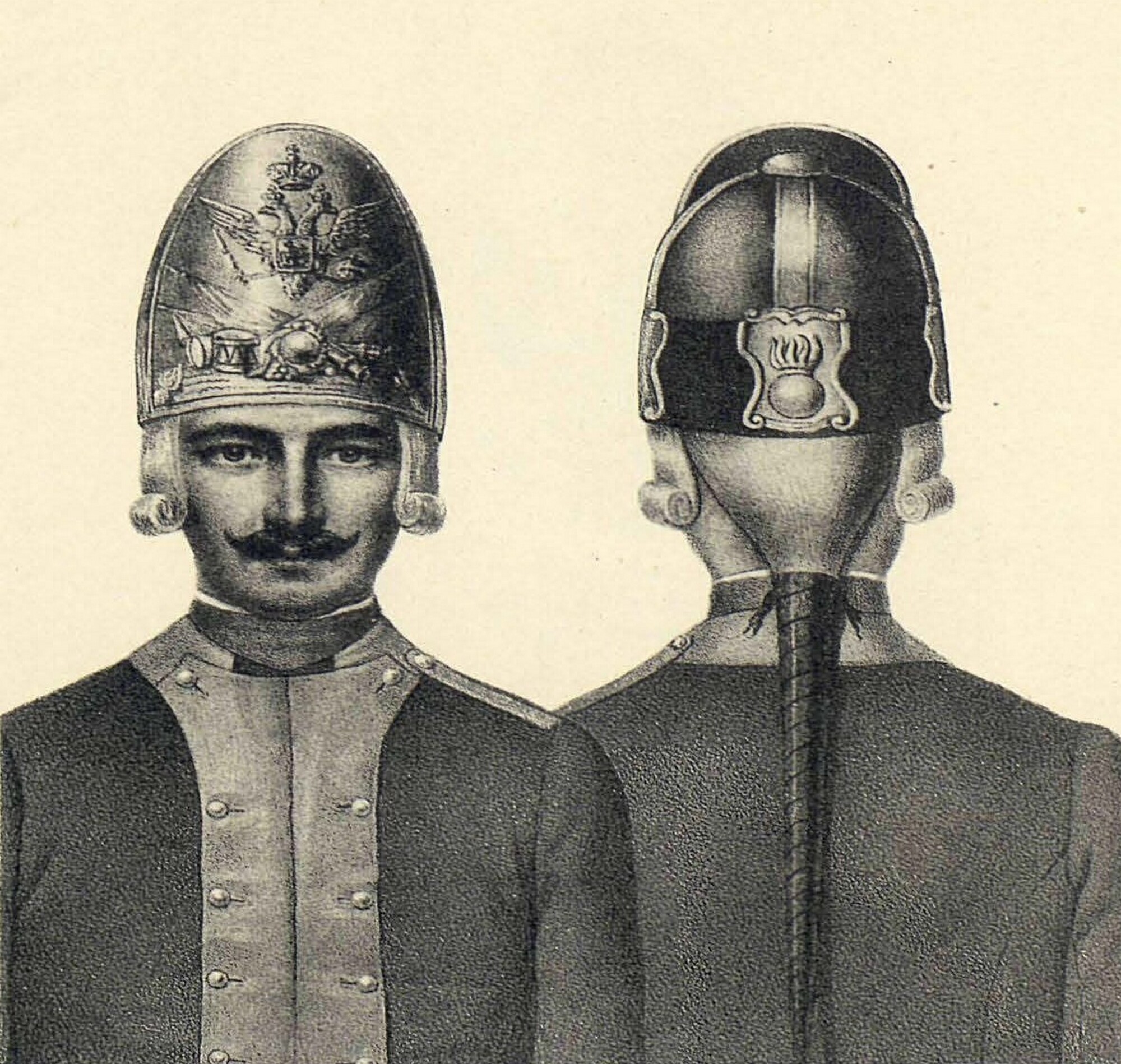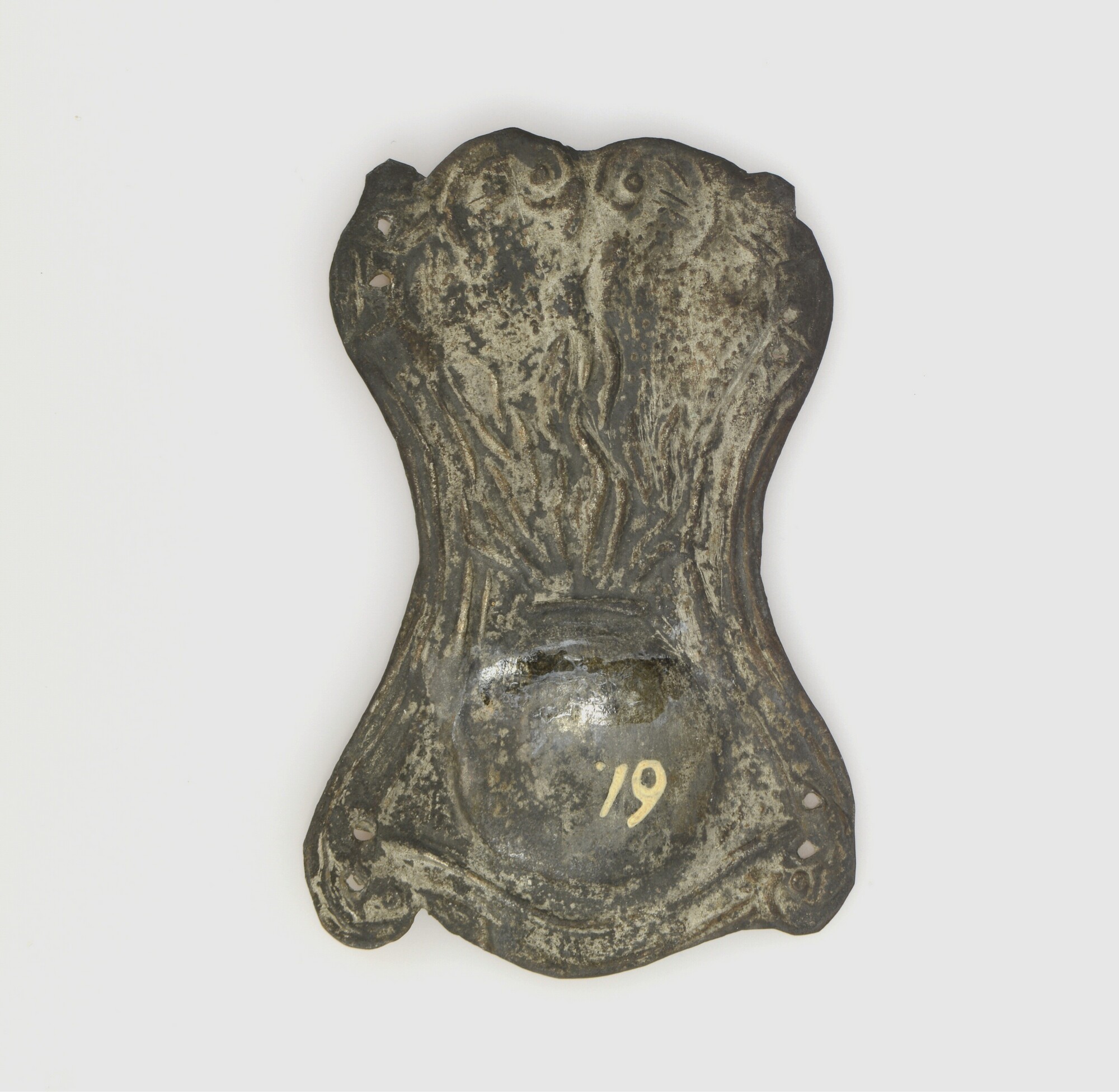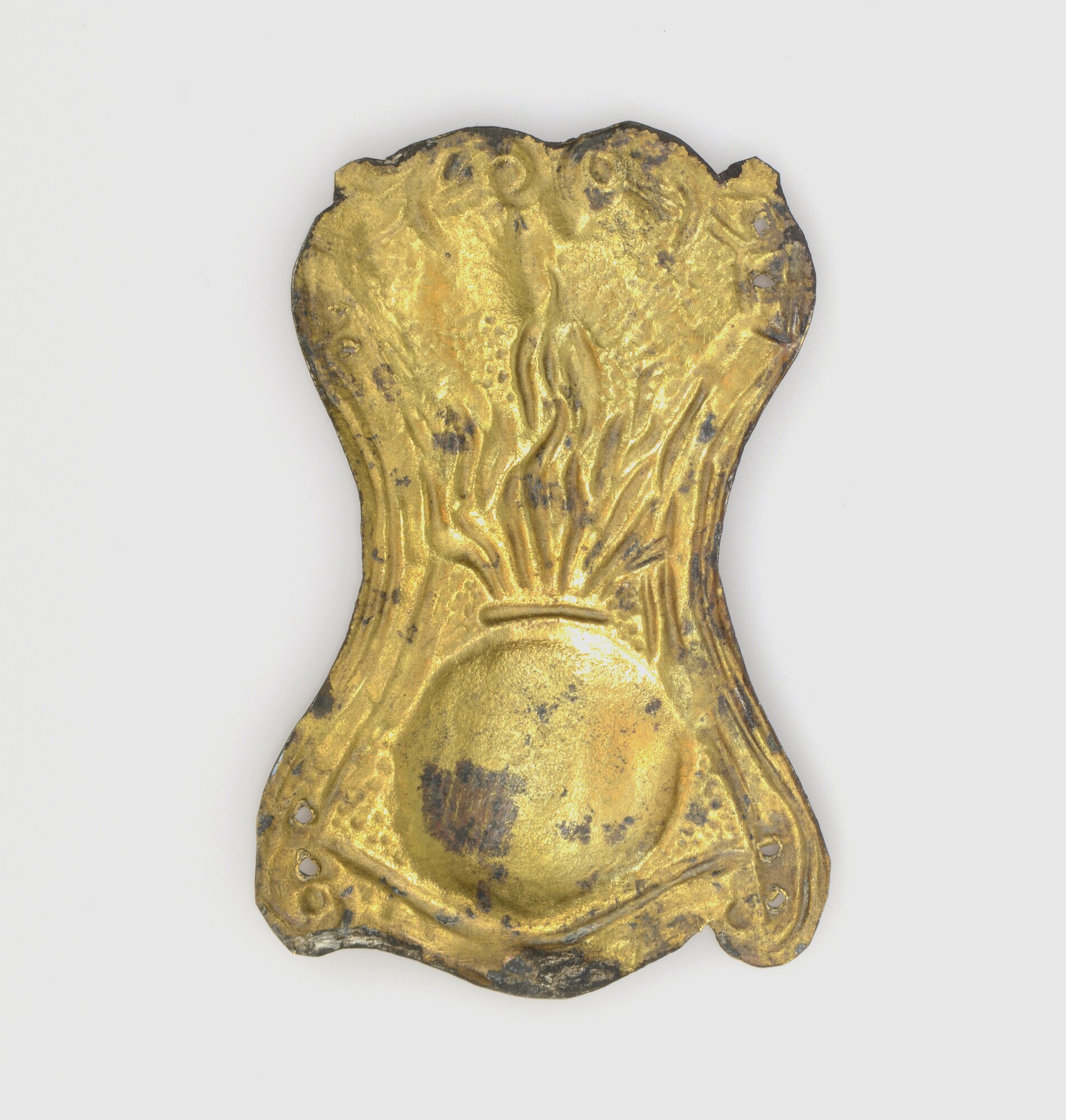Insigne; zandlopervormige beslagplaat met in relïef een brandende granaat; voluten langs de rand; dubbele naaigaatjes op de hoeken; mijter-insigne Russisch regiment grenadiers; vondstdatum 26-9-1934.