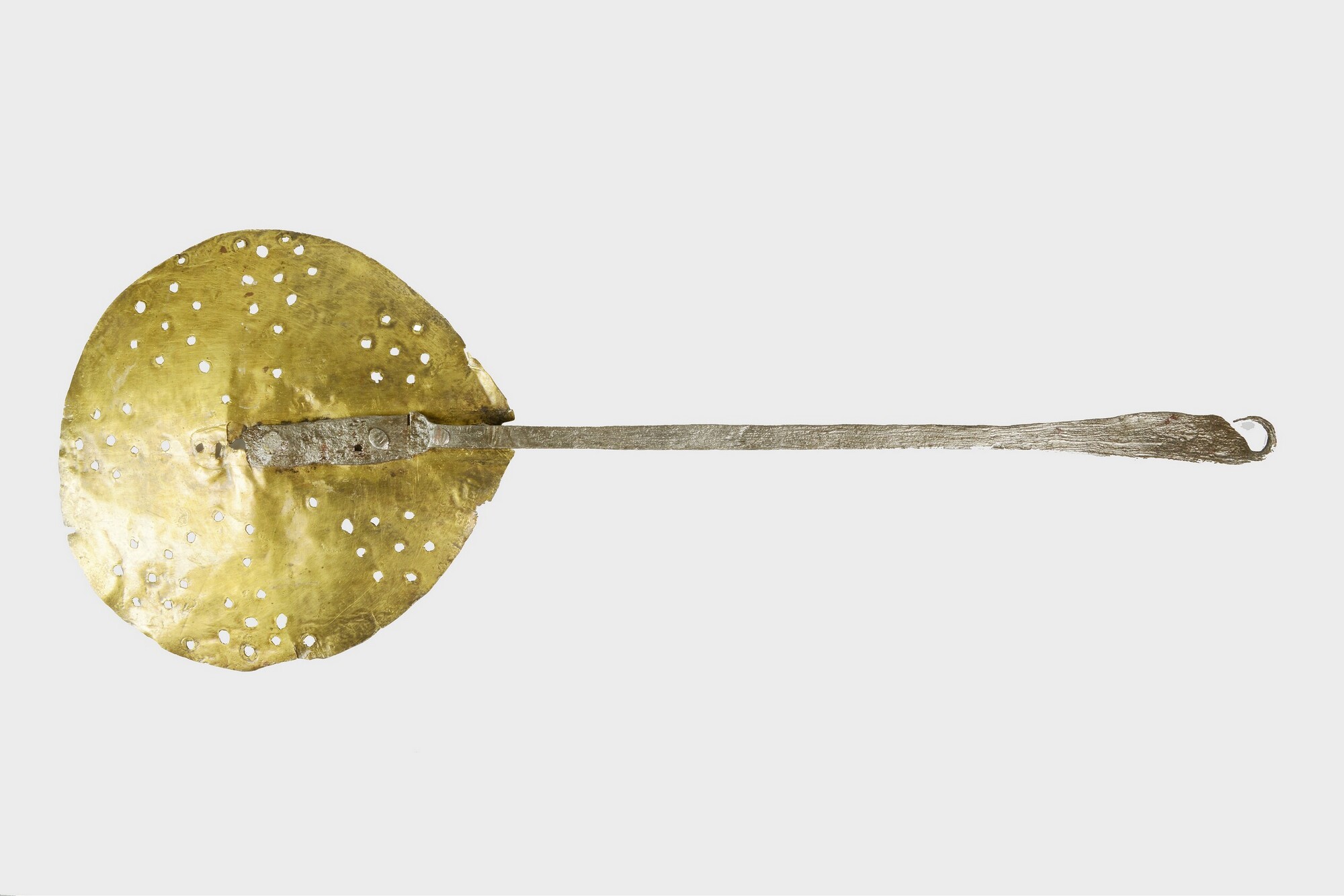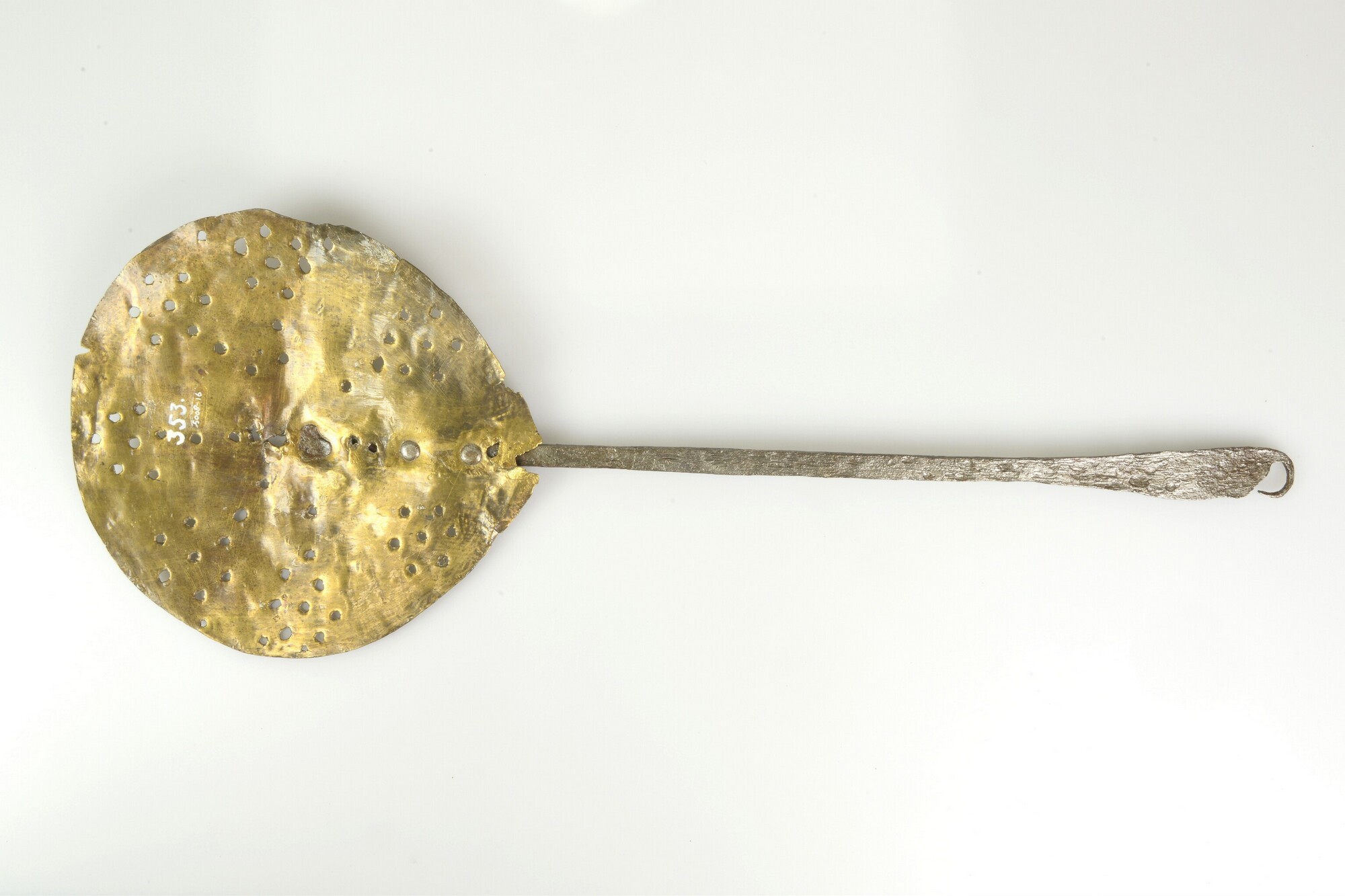 Schuimspaan; ronde, gehavende bak met ronde perforaties; smalle, langwerpige steel met ophangoog aan het uiteinde; de bak zit met drie nagels vastgeklonken aan de steel; vondstdatum: 01-09-1934