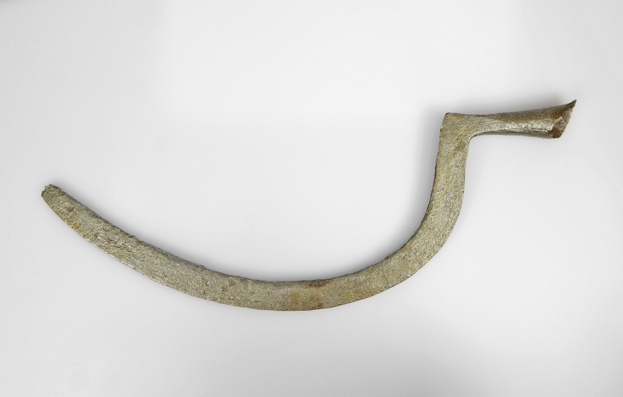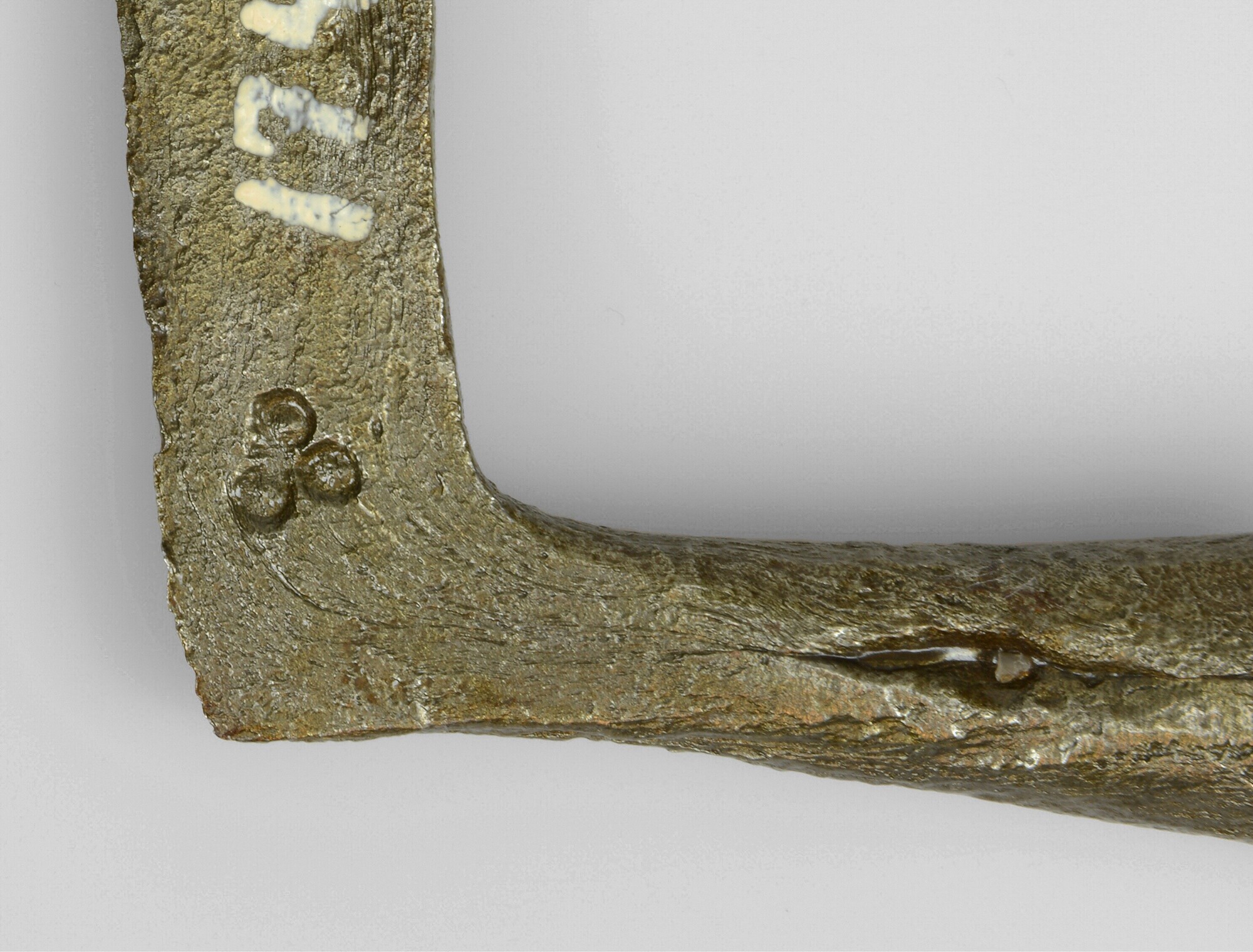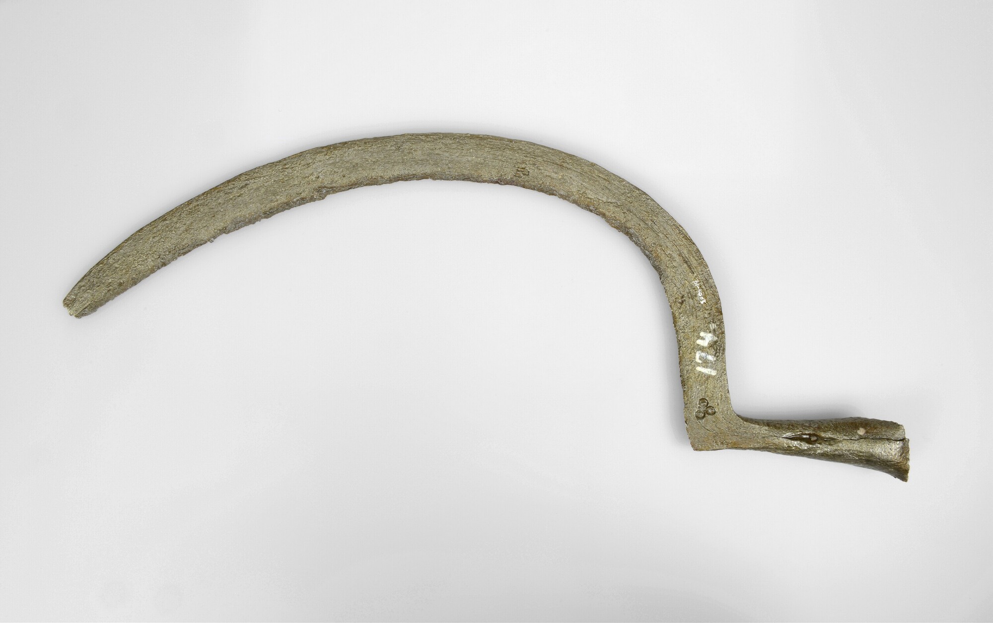 Sikkel; aangesmede huls voor bevestiging steel, merkteken op aanzet blad: driepas; vondstdatum: 03-09-1934