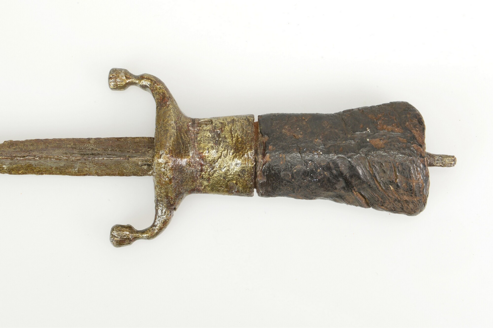 Klootdolk; greep van wortelnotenhout (?), taps naar boven oplopend en halfrond in doorsnede. Centraal gat met de angelpunt, geen angelknop. Onderaan loopt de greep uit in twee bolvormige uitsteeksels waarbij de kloten ontbreken. Slanke kling van driehoekige doorsnede met drie uitgeholde vlakken en uitlopend in een punt; vondstdatum: 24-09-1934