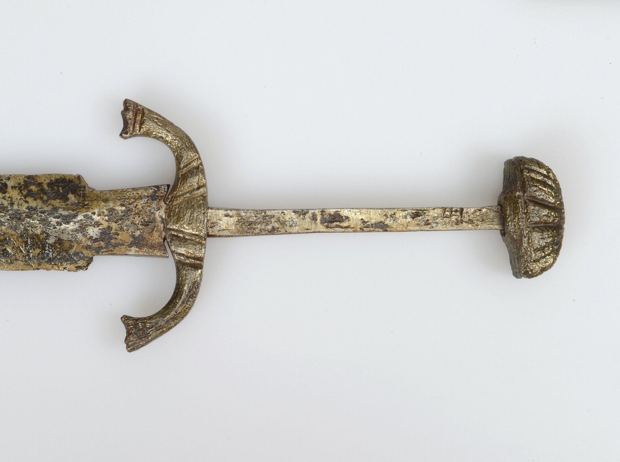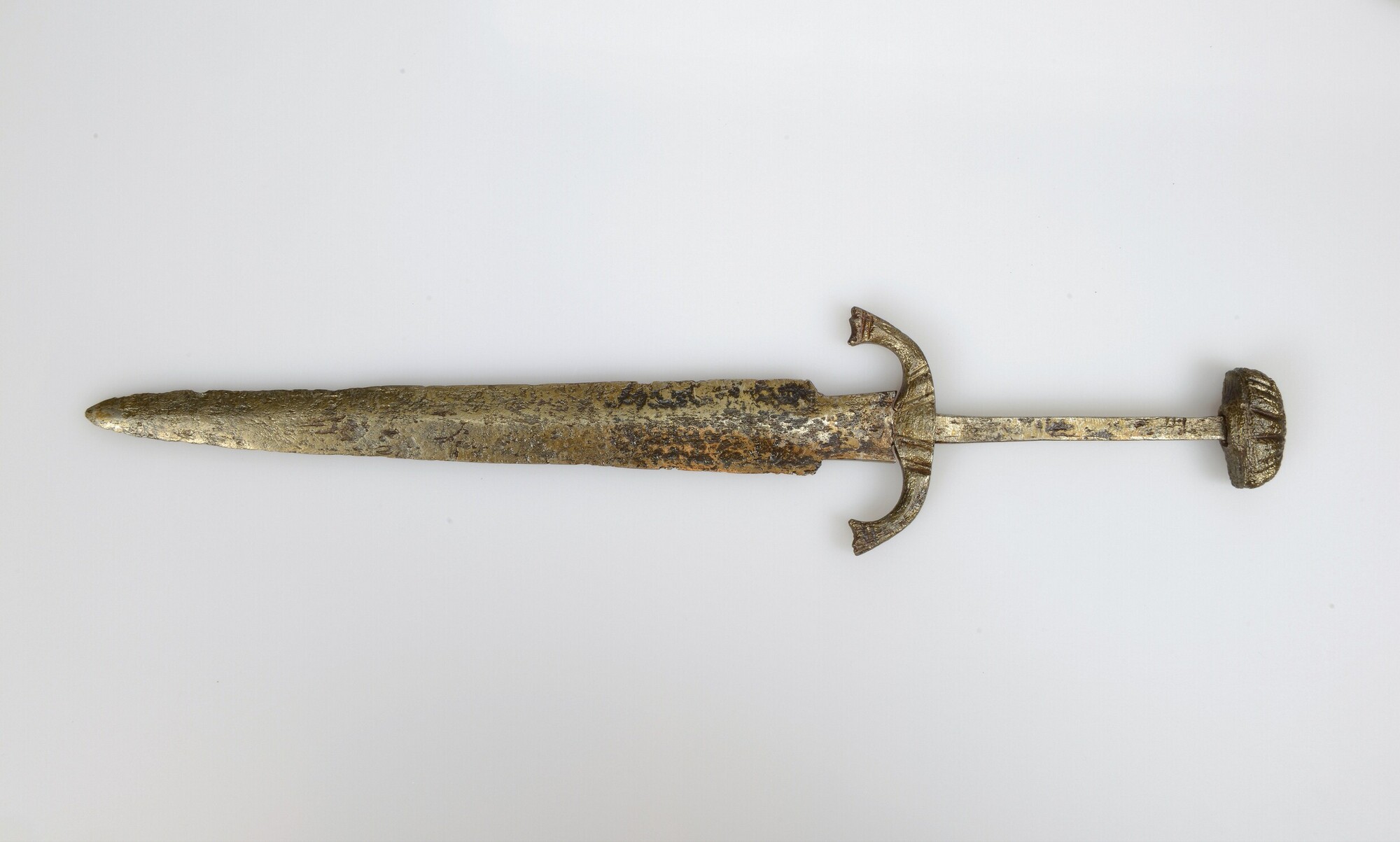Dolk; type Quillon-dagger/landsknecht met licht ruitvormig lemmet; half ovale pommel aan het einde van het heft; heftbeschermer met aan weerszijden naar de punt gebogen ijzeren staafje; heftbeschermer en pommel versierd met diagonale groeven; militaire dolk; vondstdatum: 20-09-1933; gevonden aan de taludkant langs de kerkegrond