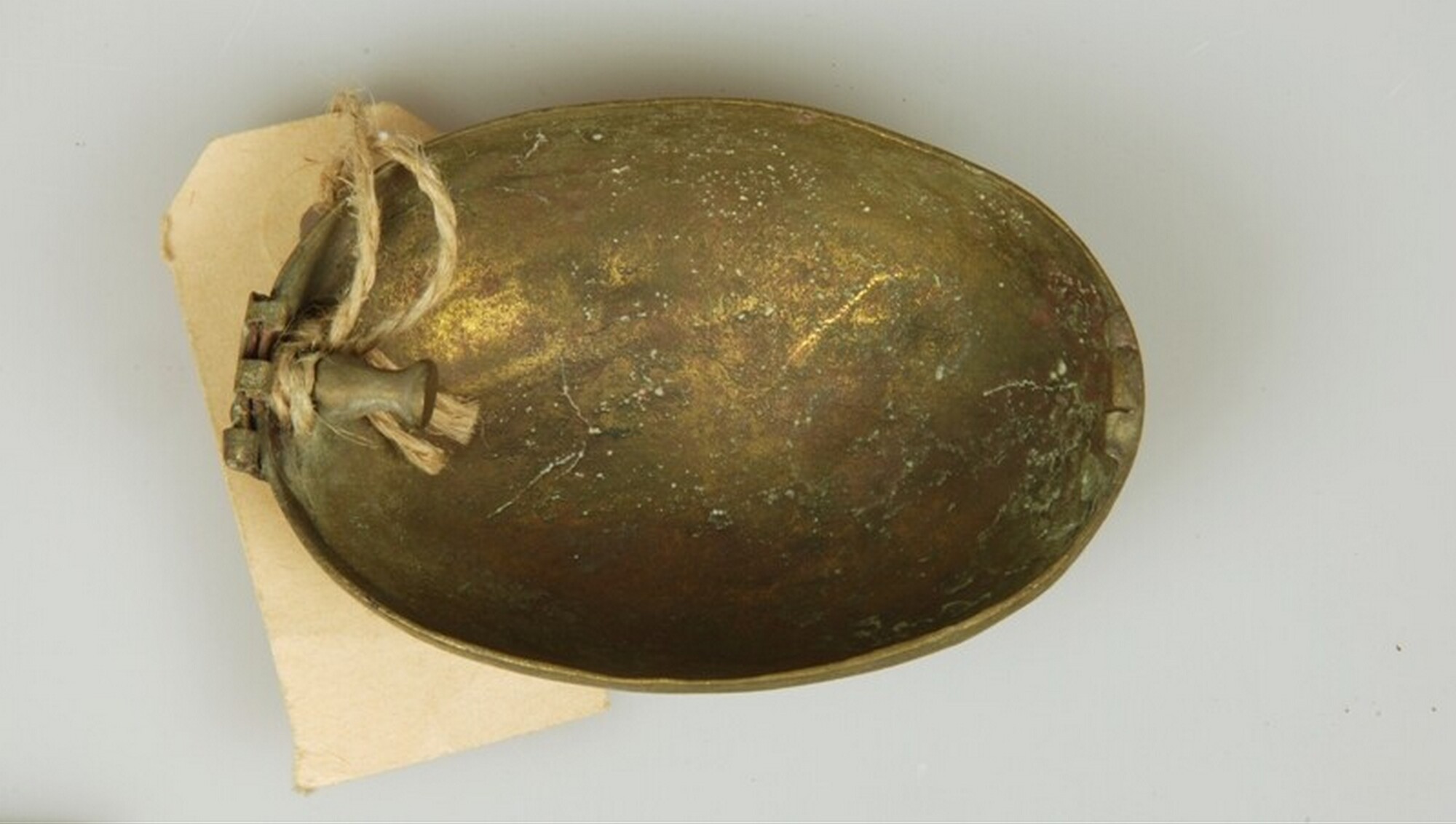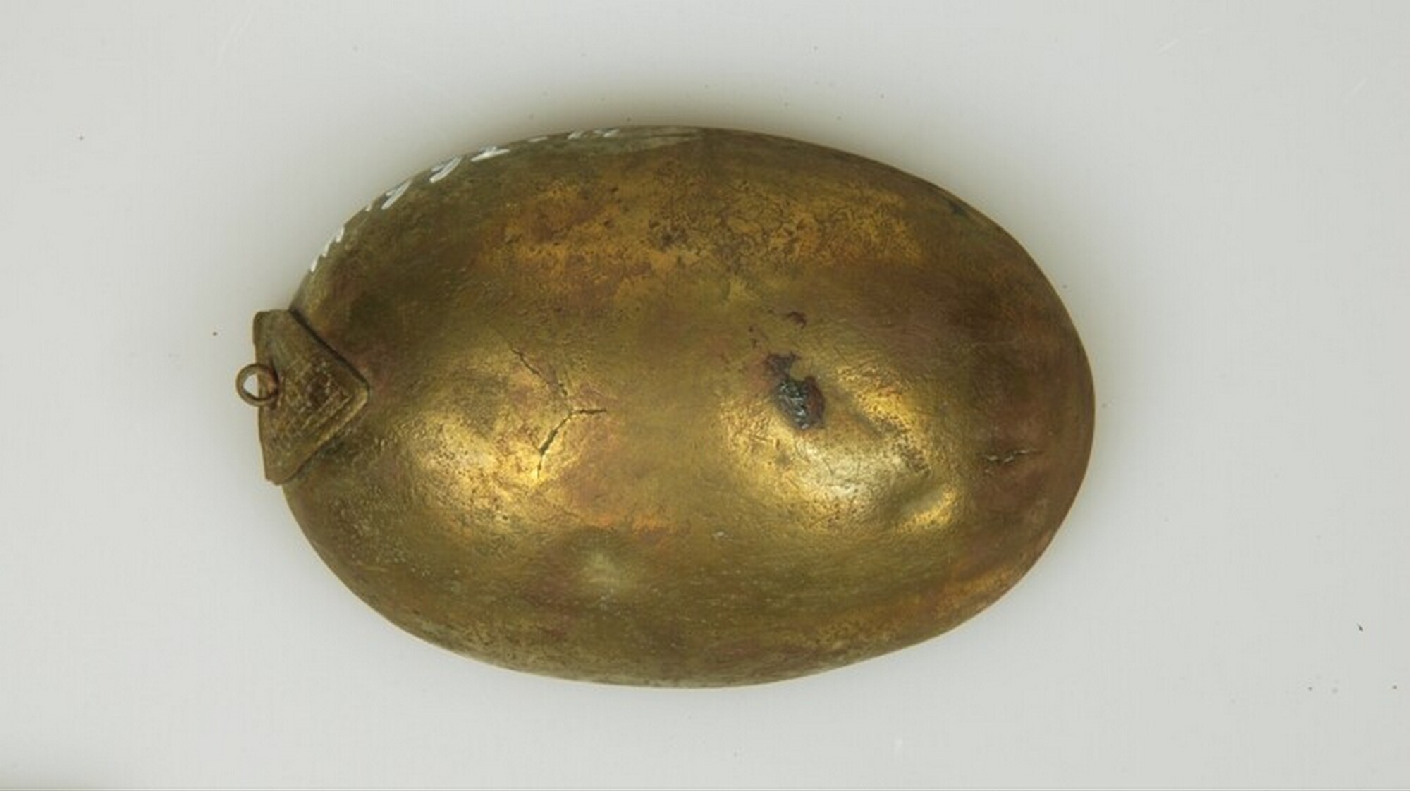 Tabaksdoos; eivormig; driehoekig scharnier versierd met gegraveerde lijnen; daaraan bevestigd een ophangoogje voor een ketting; deksel ontbreekt