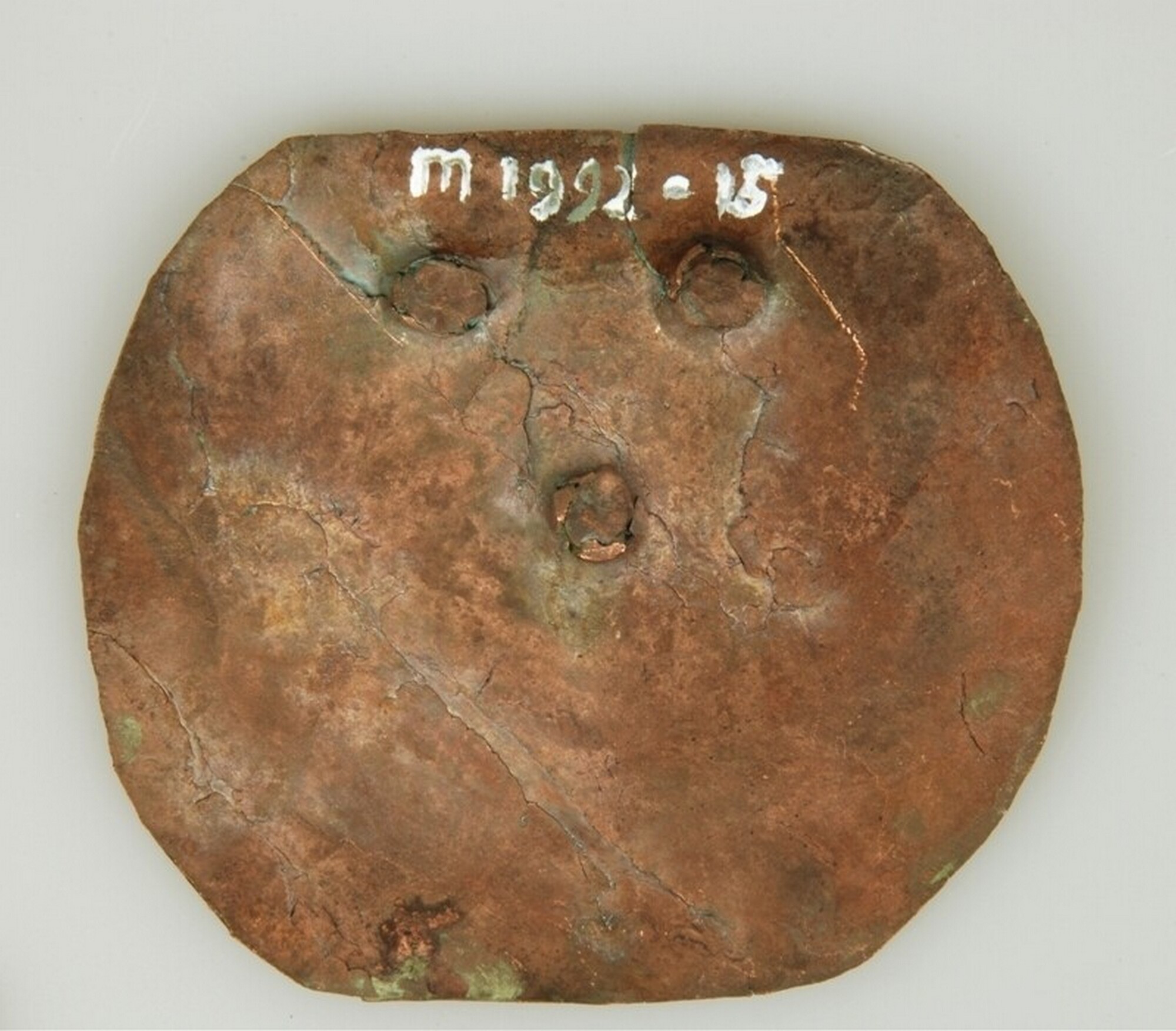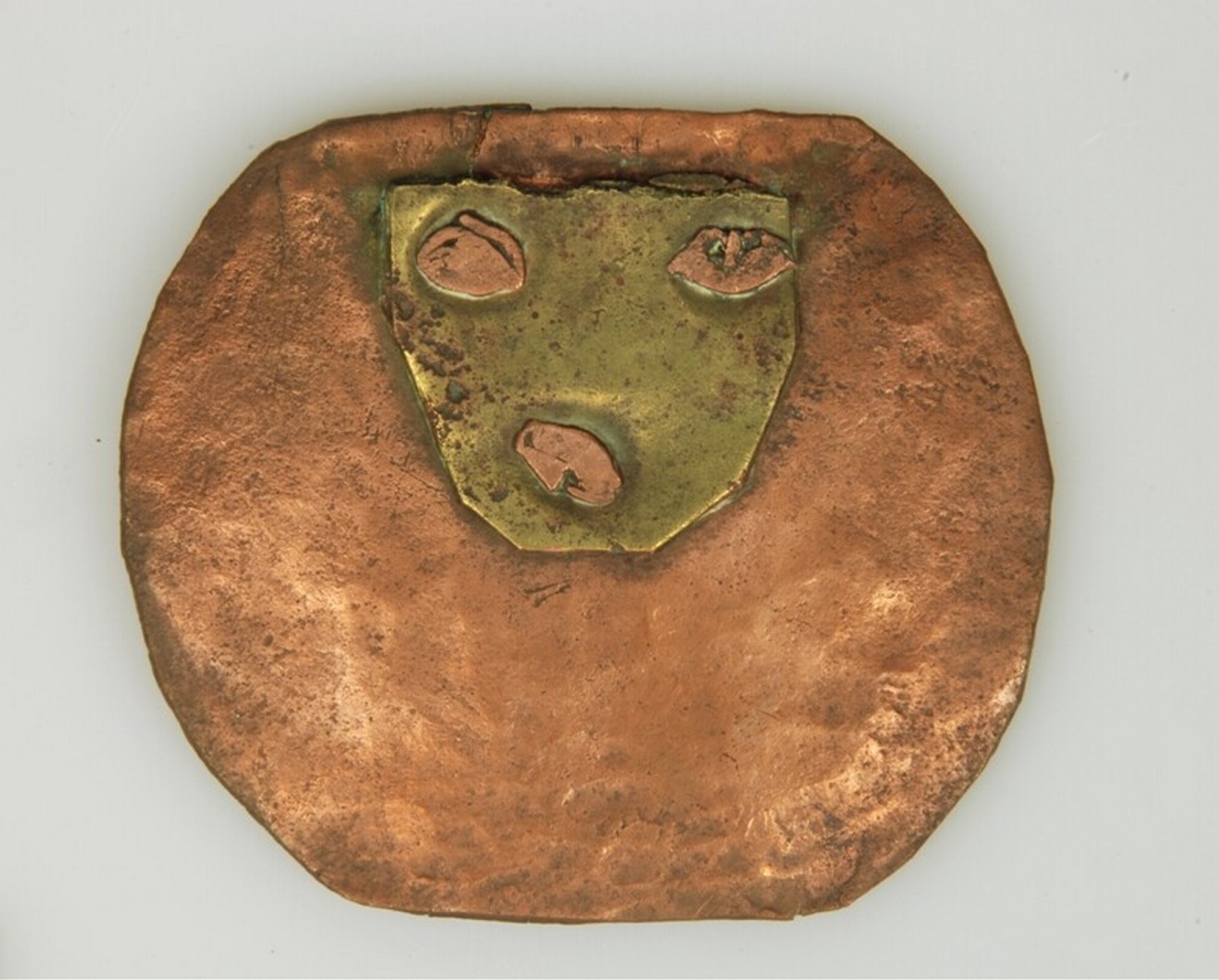 Deksel; rond; messing beslagplaat met drie koperen klinknagels; scharnier ontbreekt