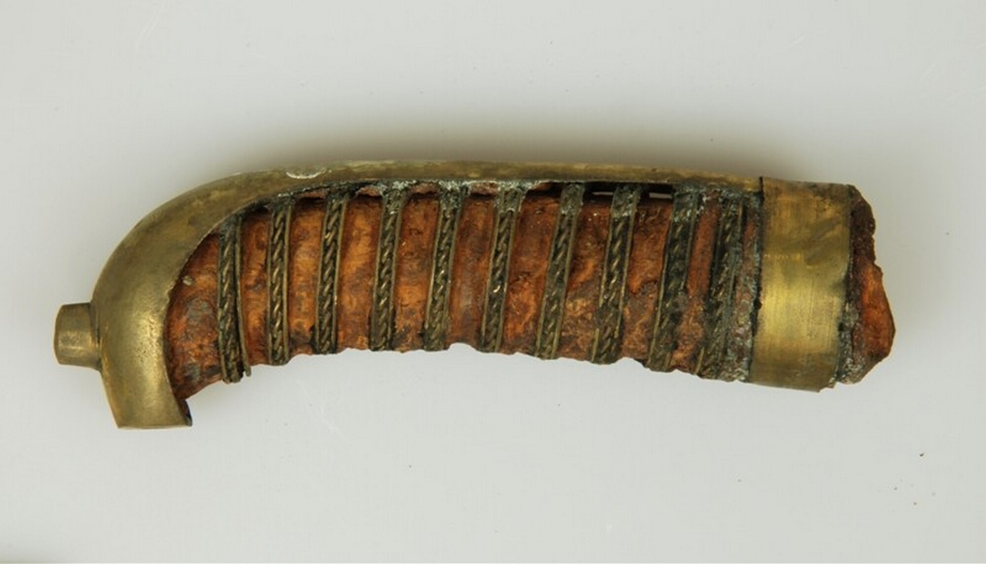 Sabel / sabelgevest; gesmeed ijzer met houten heft, omwikkeld met messingdraad en voorzien van messing beslag; vervaardigd ten tijde van de Bataafse Republiek en Koninkrijk Holland (Franse Tijd); herkomst: waarschijnlijk Solingen, Duitsland