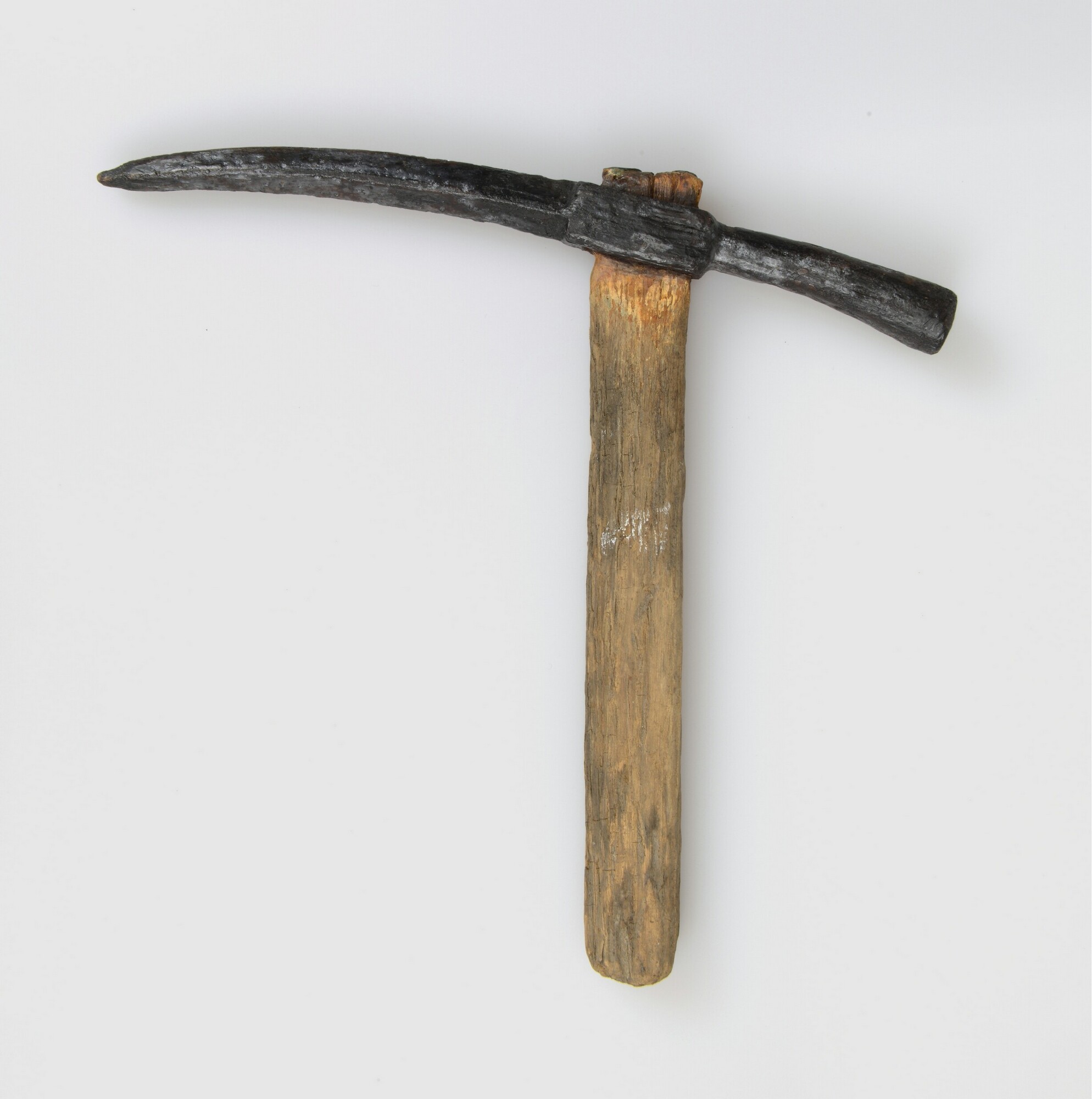Hamer; hamer met scherpe punt en ronde, platte achterzijde; houten steel