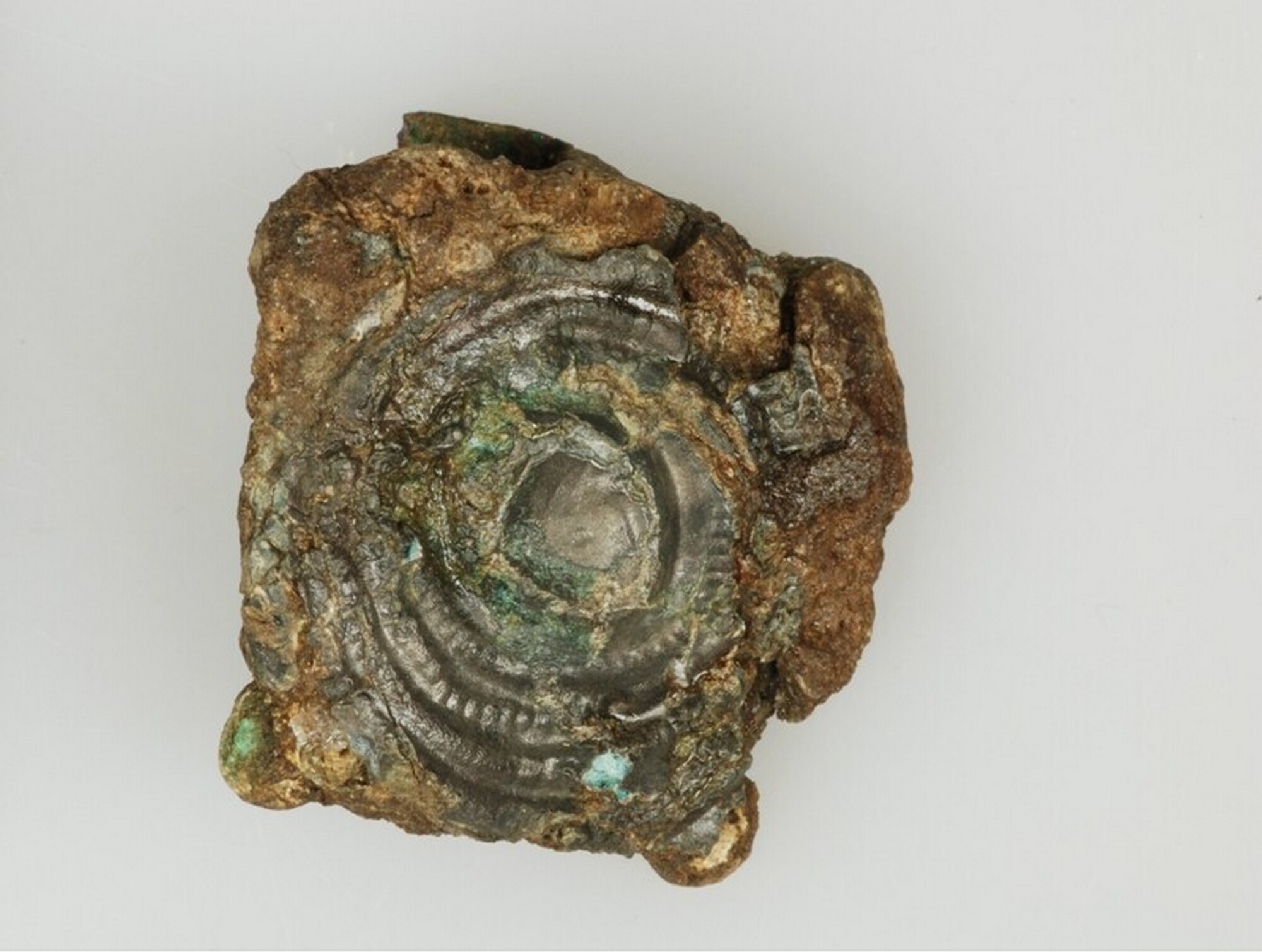 Schijffibula; Germaans; geperst sierblik (of zilver) en hoge naaldhouder; het oppervlak is versierd met meerdere concentrische ringen met parels van verschillende diameter rond een centrale ronding; aan vier zijden pendanten, versierd met inwaarts gerichte groeven