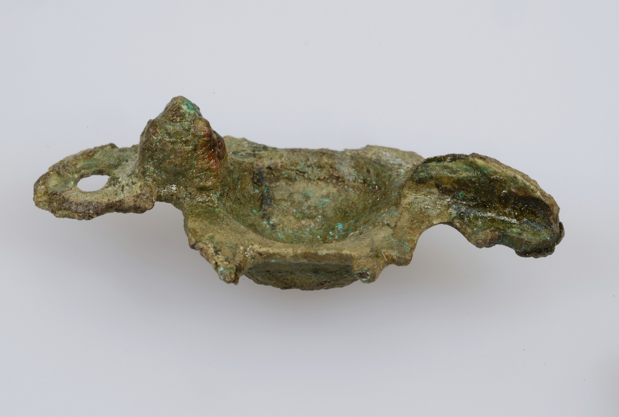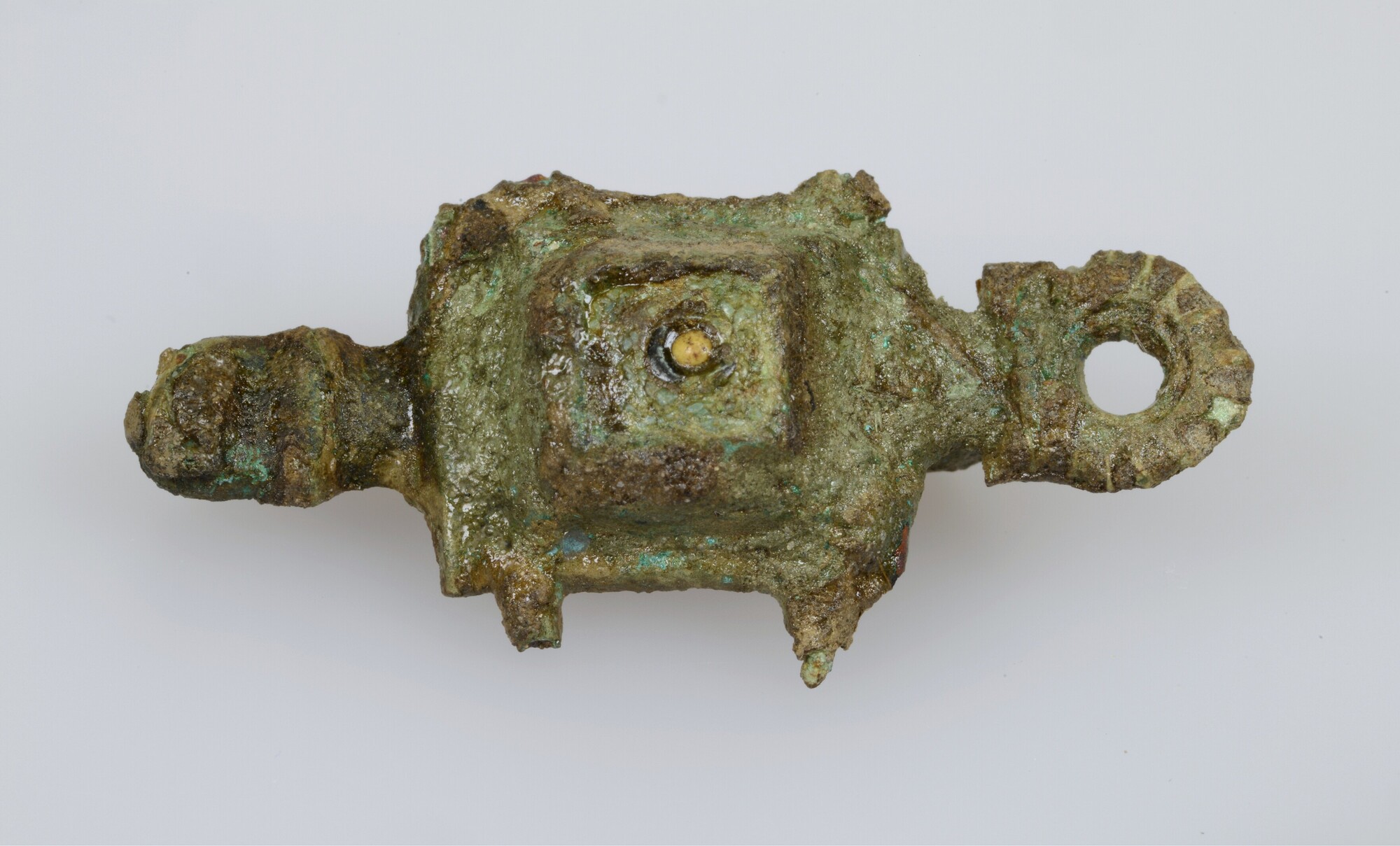 Gelijkzijdige fibula; vierkante plaat met aan alle vier de zijden een oog of knop; onder de knop bevindt zich de naaldhouder; aan de bovenzijde van de vierkante middenplaat een kleiner opstaand vierkant met een centraal gat waarin nog resten van lichtgeel email te zien zijn