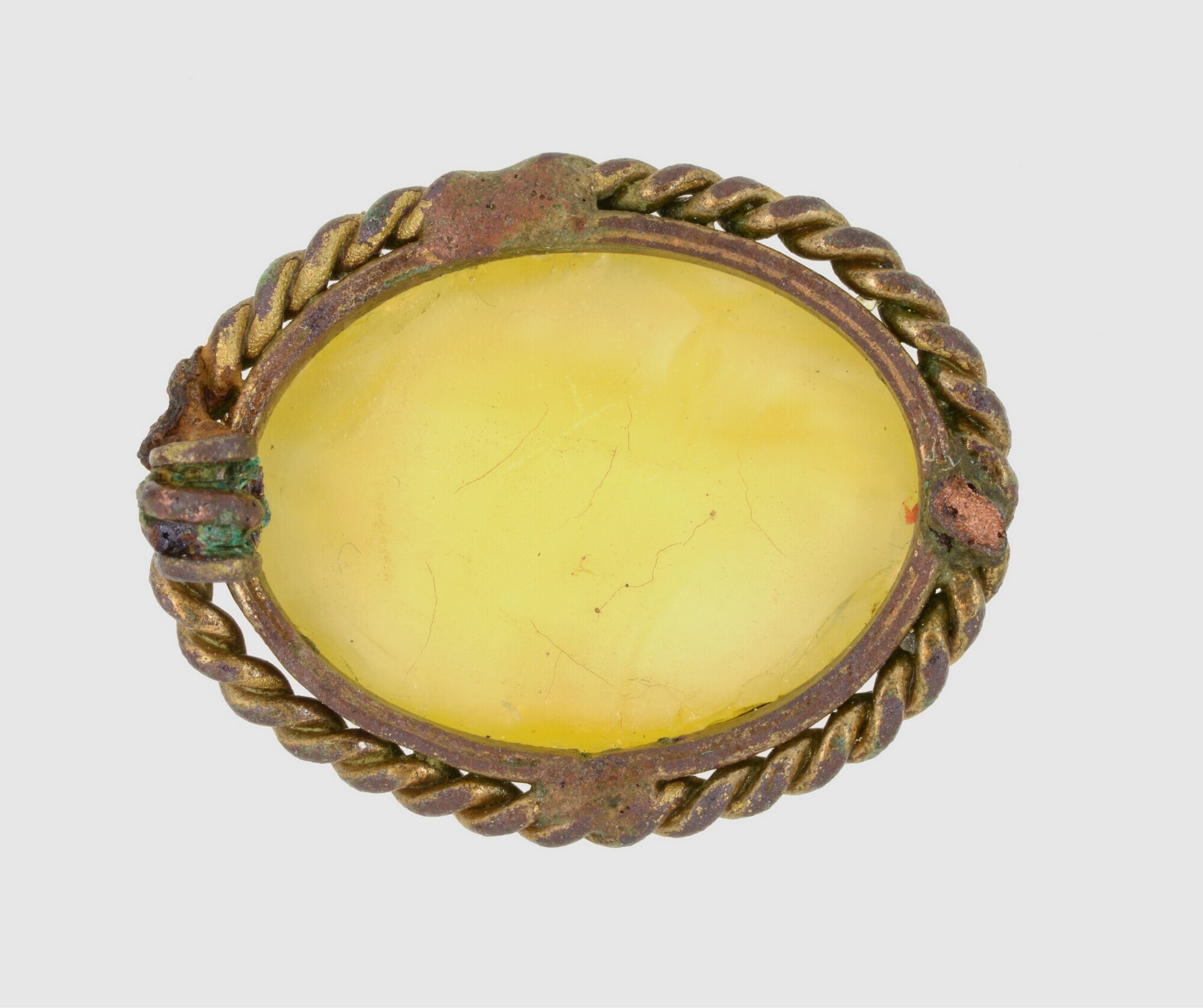 Broche; ovale gele steen (van glas?) in zetting van getordeerd koperdraad; bevestigingsnaald aan de achterzijde ontbreekt; vondstomstandigheden: aanlegvondst; vondstdatum: 27-3-1996