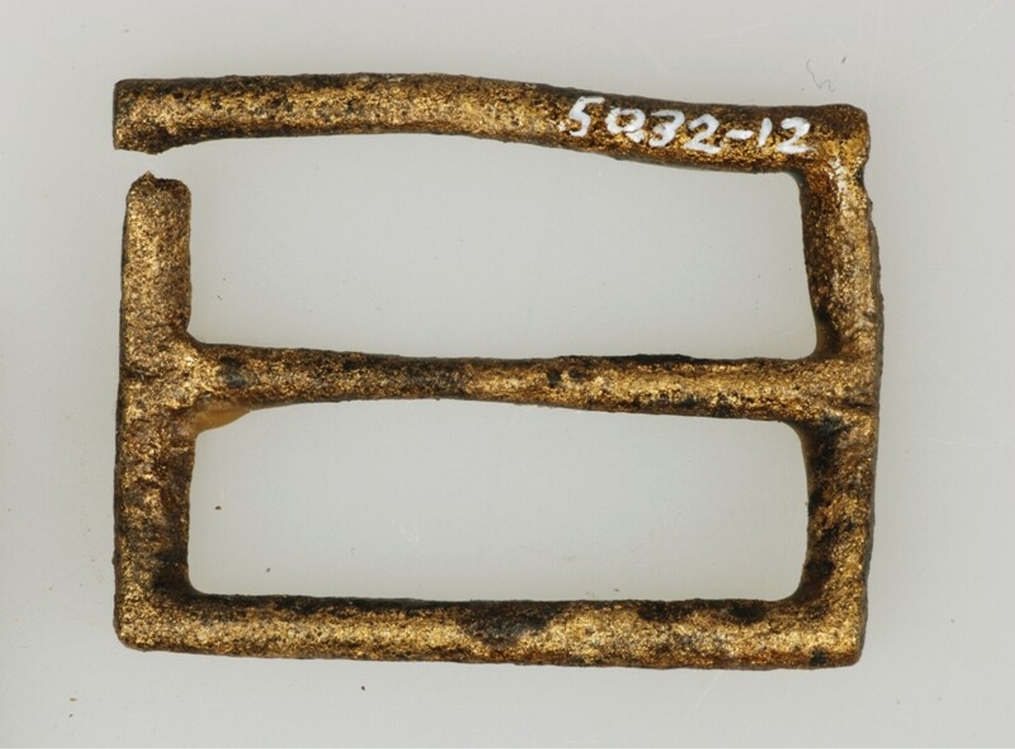 Gesp; cz-ges-?; aan een zijde is het messing gebroken; vierkante vorm; vondstomstandigheden: detectorvondsten uit donkere ophogingslaag; datum: 3-4-1996